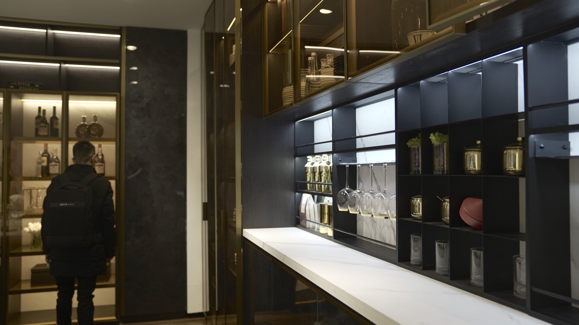 这些在展馆上展出的全屋新品是好莱客轻奢极简的瓦尔登湖系列,简洁通透的玻璃和金属材质搭配,碰撞出一种安静、儒雅的高级感,让人倍感舒适和宁静。