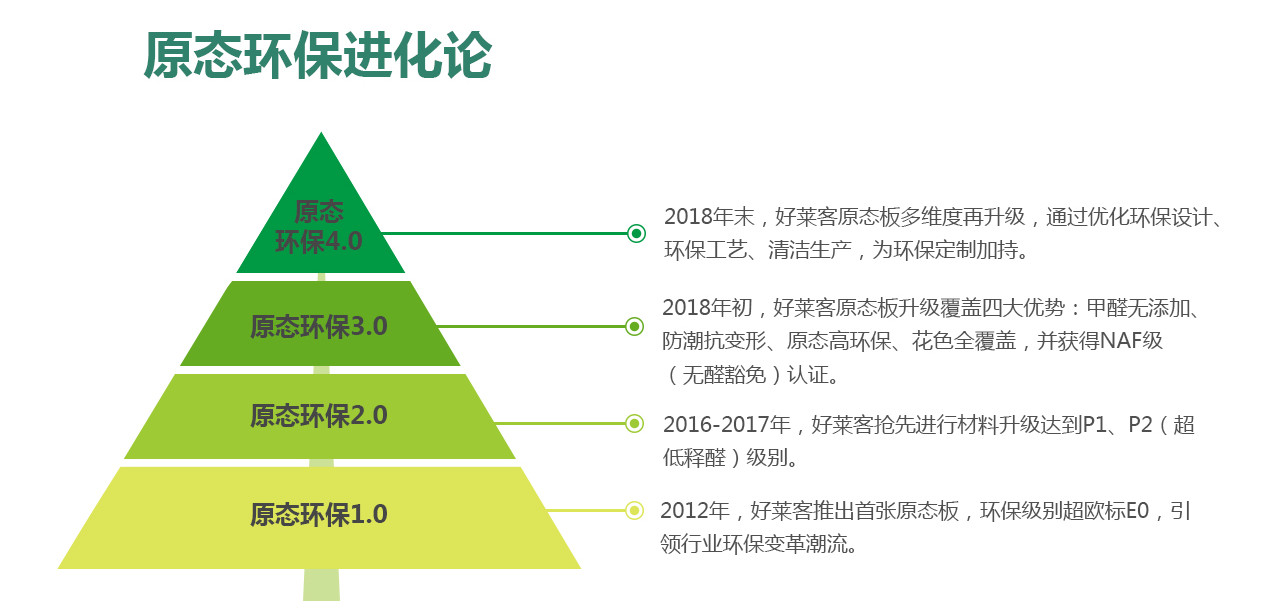 2012年,经过潜心研发,好莱客推出高品质环保板材——原态板,基材选用西南林区优质纤维为原材料,加以医疗、军事等领域常用的MDI生态粘合剂制作而成,真正实现基材甲醛0添加,并获得由CARB(美国加州空气资源委员会)颁发的NAF(无醛豁免)认证。至今7年间已升级至环保4.0品质。