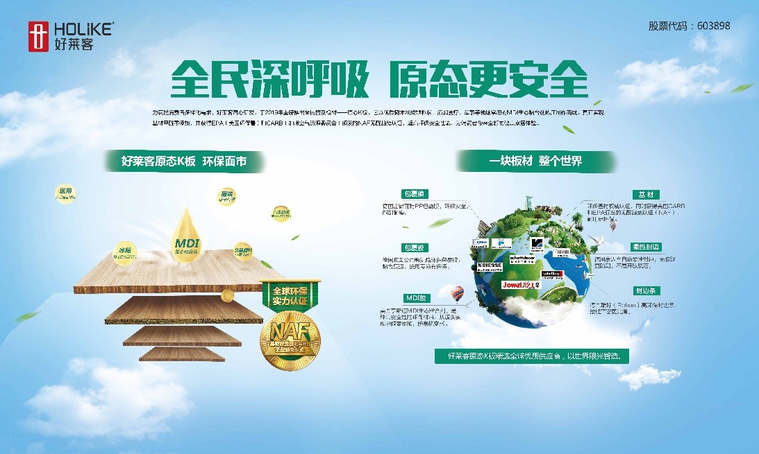 在产品战略上,好莱客顺应环保消费升级,升级企业王牌产品原态板、重磅推出原态K板,采用MDI无醛生态粘合剂,环保性能越级提升,护航全民家居健康,服务“环保型消费者”。在生产和工艺上,好莱客为绿色生产、清洁生产而努力,为行业和市场提供更优质和健康的产品。