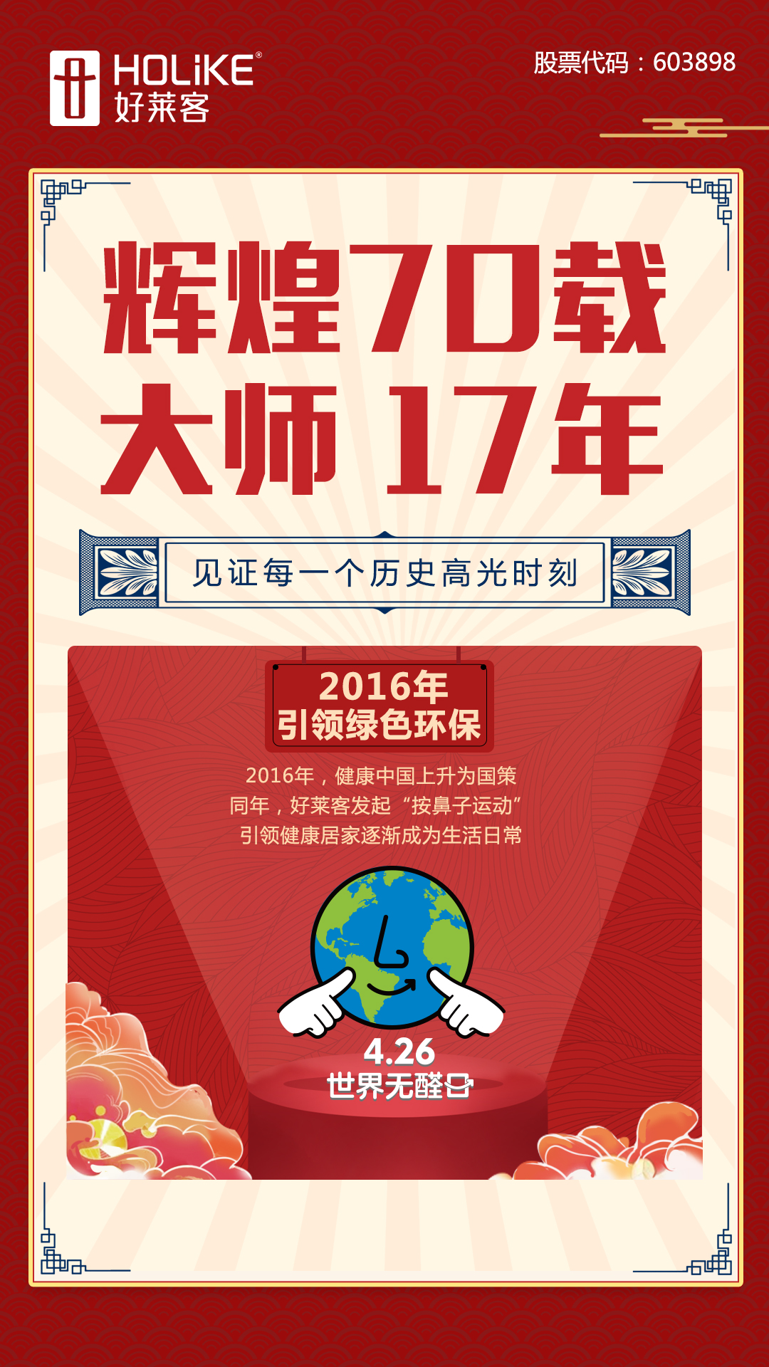 2016年,习近平总书记在全国卫生与健康大会上发表重要讲话,提出“健康中国”策,“要把人民健康放在优先发展的战略地位”。好莱客立身于家居领域,不断研发升级健康环保、“基材甲醛零添加”的原态系列产品,同年4.26世界无醛日发起“按鼻子运动”,引领健康居家逐渐成为生活日常。