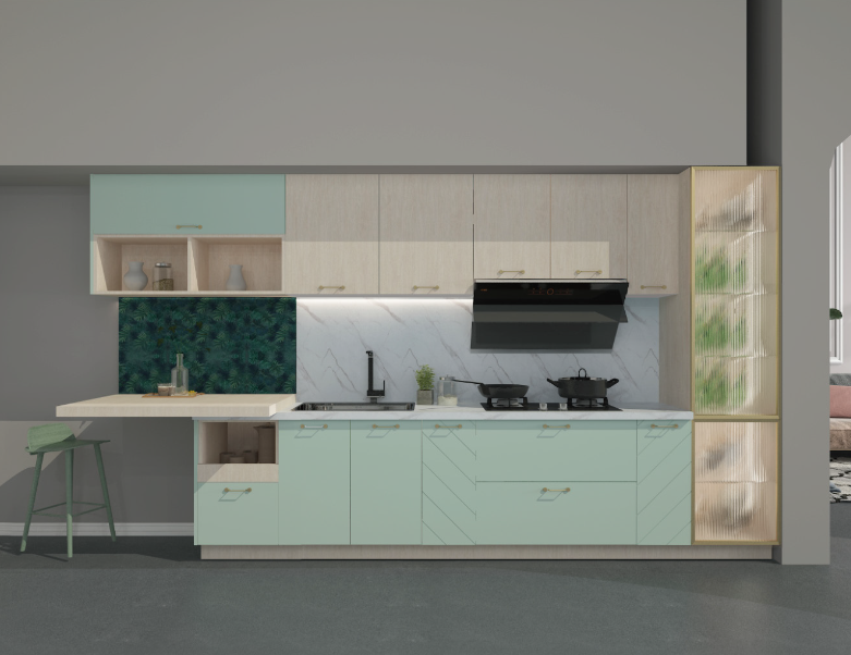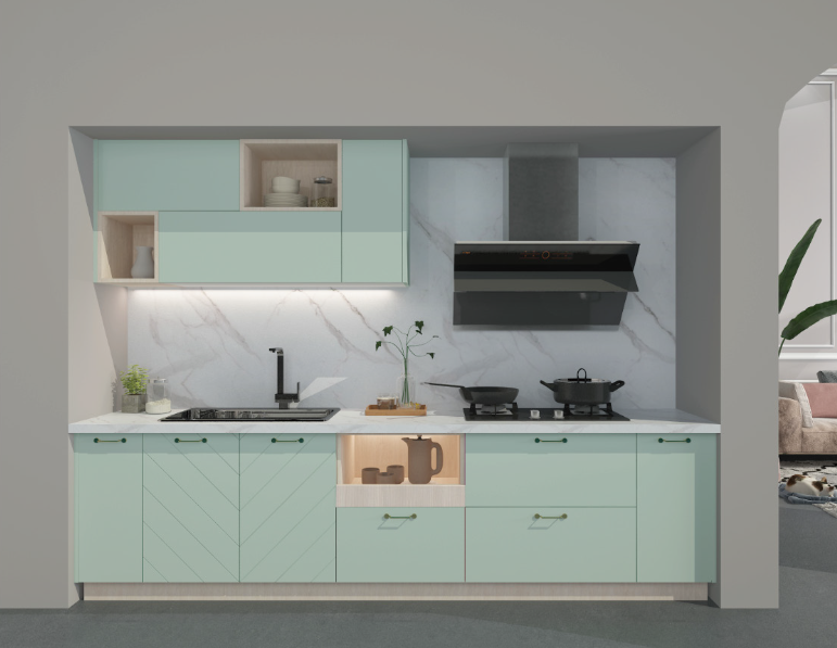 一字型橱柜-适配小户型家居,灵活的小家电柜以及适度比例的开放格设计,配合金属拉手,打造厨房精致空间。