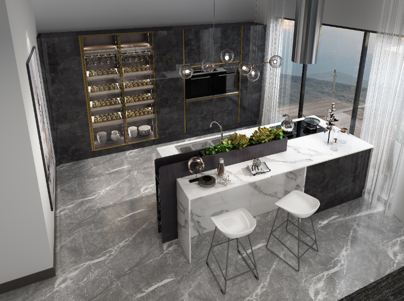 双一字型橱柜-金丝黑檀玻璃柜营造的通透感,搭配云墨石门板、雪云台面、金丝拉手点缀,造就高端艺术“家”。