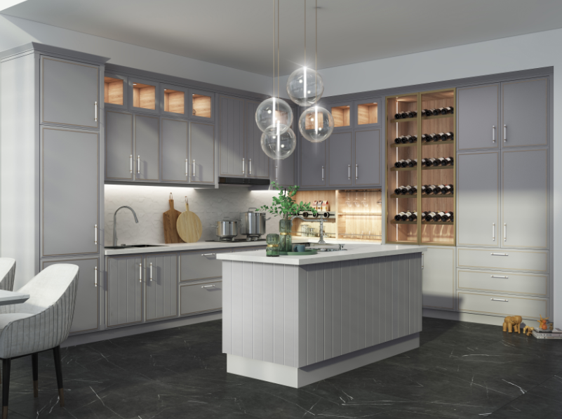 配合格瑞拾光全屋系列的色调与简欧氛围,格瑞拾光系列橱柜沿袭全屋设计中的浅烟灰木纹与金属嵌条的运用,营造个性舒适、精致优雅的视觉氛围。