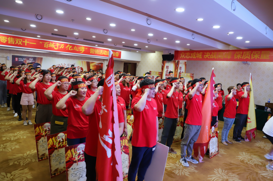 10月17日、18日,好莱客全域营销倾力出动,与全国经销商家人齐聚广州,以全面提高经销商新零售团队的专业技能以及职业素养,赋能终端门店为首任,开展了两天一夜的全员作战精准培训,全体营销战士与经销商家人全员同心聚力,挥毫立下军令状,百人誓师,一场热血轰动的集结盛典正式拉开好莱客双11大促冲刺的帷幕。