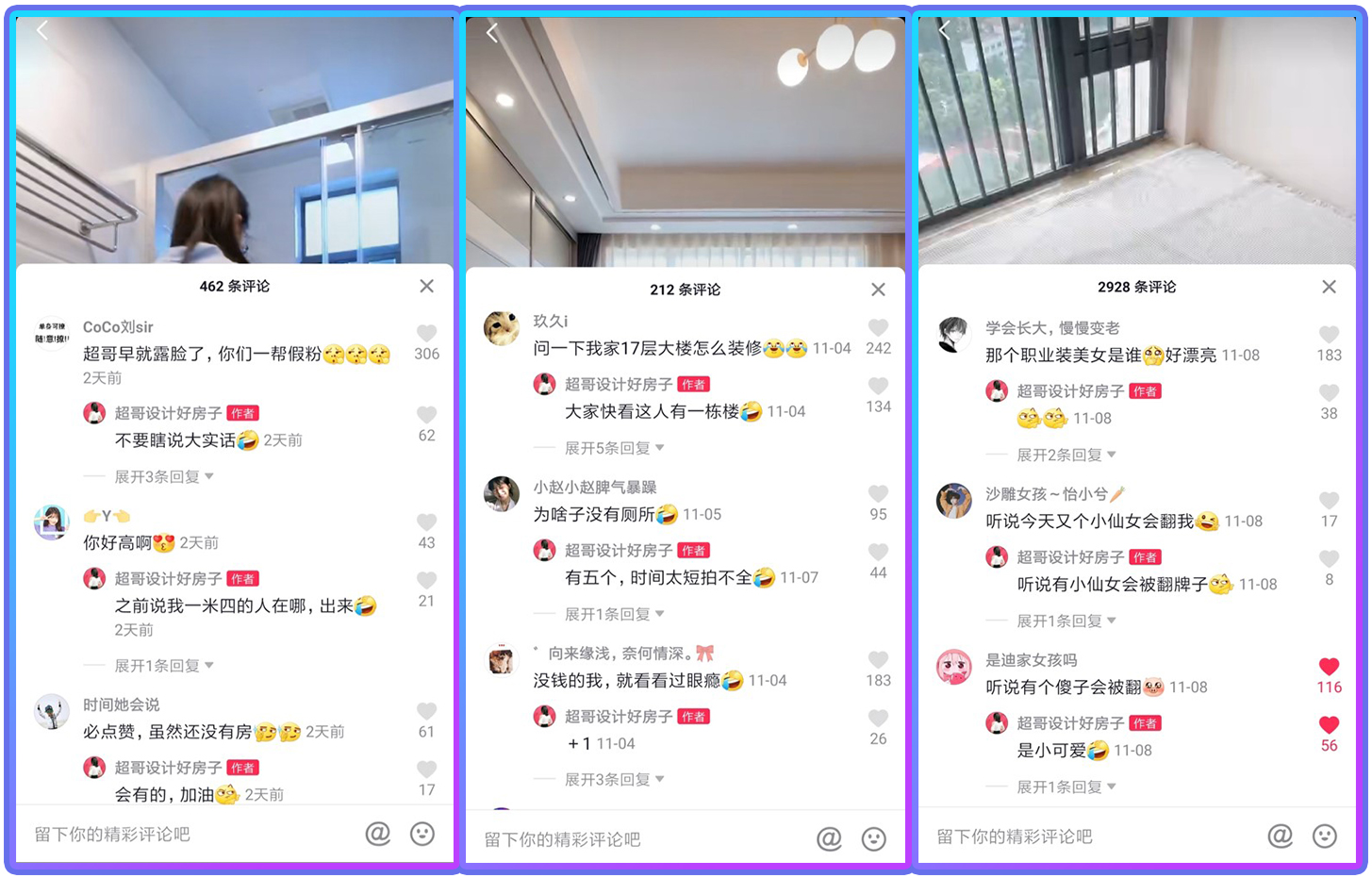 一是大量短视频用户愿意为家装类短视频买账。很多粉丝都非常关注家装类知识,尤其是家装短视频更能引起粉丝的关注和互动,他们甚至会主动私信超哥,让超哥为他们设计房子。