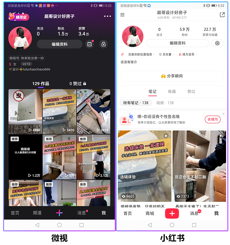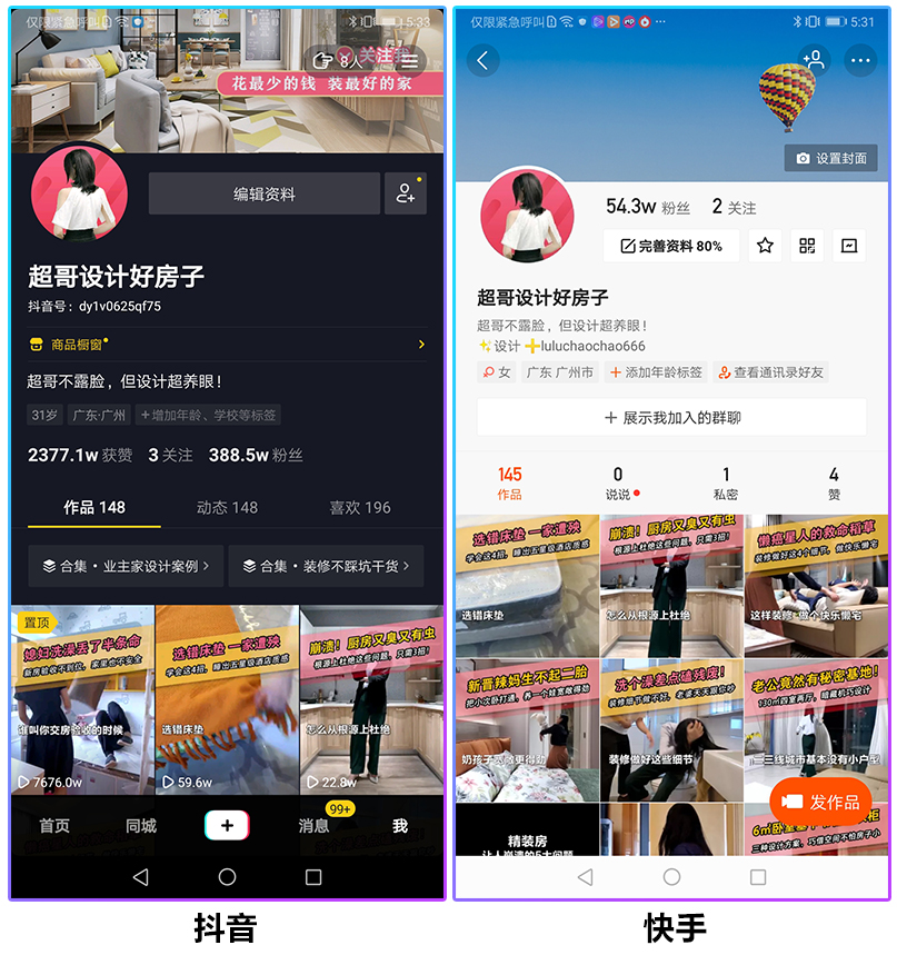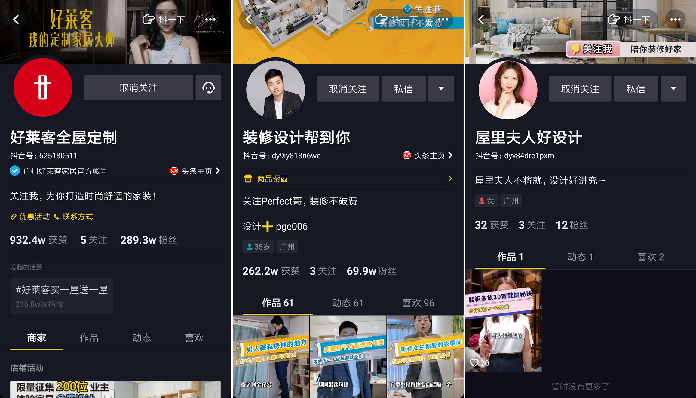 除了打造超哥这个短视频大V,好莱客新零售短视频团队还在全网搭建短视频矩阵,官方账号【好莱客全屋定制】及其他家居达人号【装修设计帮到你】、【屋里夫人好设计】也在各大平台分享原创优质的家装设计干货,帮用户解决各类家装难题!同样优秀,值得你关注~