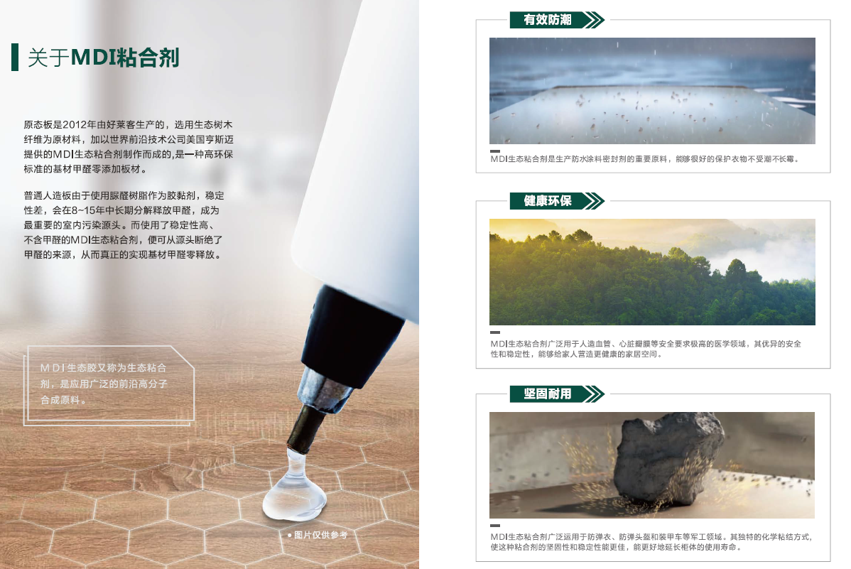 秉承打造更健康环保的生活空间、提供更高品质产品的理念,好莱客一路向前,成为行业内首批探索并应用MDI生态粘合技术的一线家居品牌。