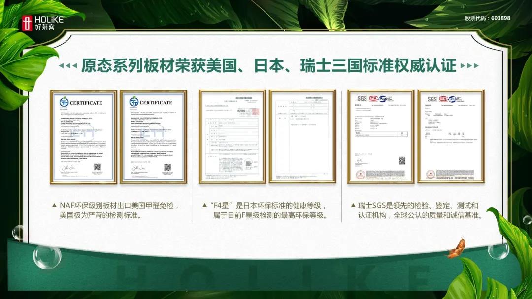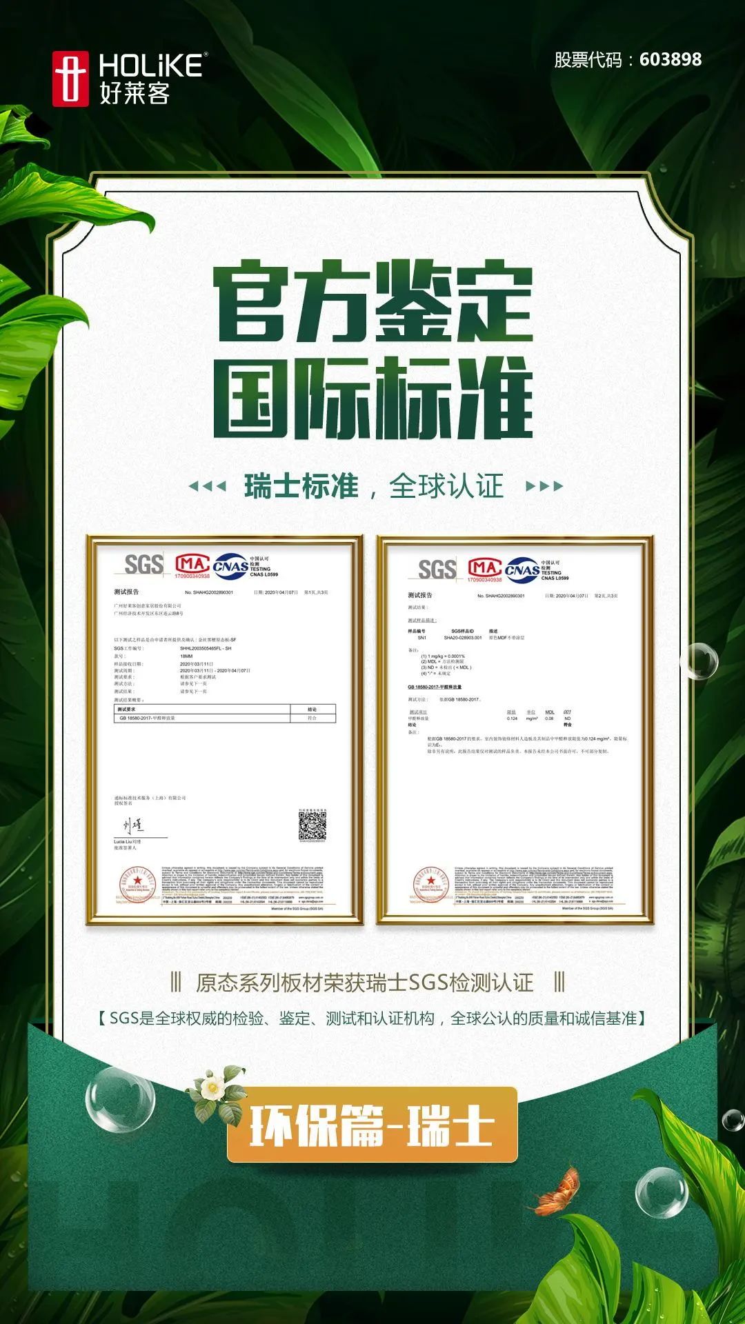 好莱客原态系列板材已经通过瑞士SGS十多项项目的权威检测认证。