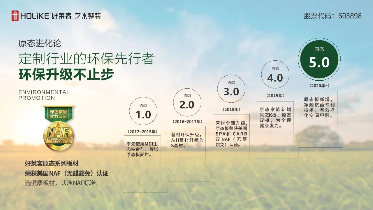 健康消费已然成为大势,但与之相对的是各种伪健康概念的植入和强行关联产品的接连上市。不同于消费热点的浅尝者,好莱客在原态领域有着持久的钻研和创新。好莱客作为定制行业的环保先行者,从2012年开始布局原态产品的研发和上市,经过8年打磨,已是行业领先的净醛抗菌技术创新者和原态净醛板生产者。而好莱客艺术整装延续好莱客的环保基因,以原态健康的家居产品,消除消费者装配过程中的健康焦虑,营造更安心的入住体验,也因此获得疫后市场的青睐。