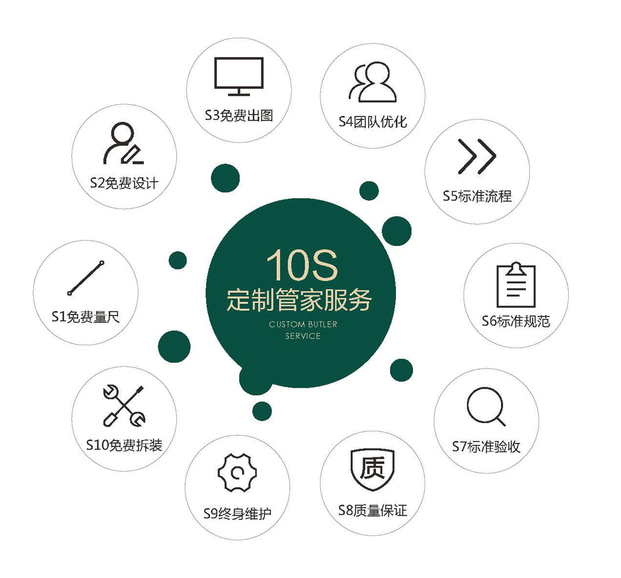 为给消费者打造大师级的定制家居体验,好莱客匠心推出了以“免费量尺、免费设计、免费出图、团队优化、标准流程、标准规范、标准验收、质量保证、终身维护、免费拆装”为内核的10s定制管家服务,从前期效果图设计,到后期安装、验收、维护保养等一系列服务都做了标准化规范,给消费者提供销售、设计、安装、售后的全方位高品质服务。