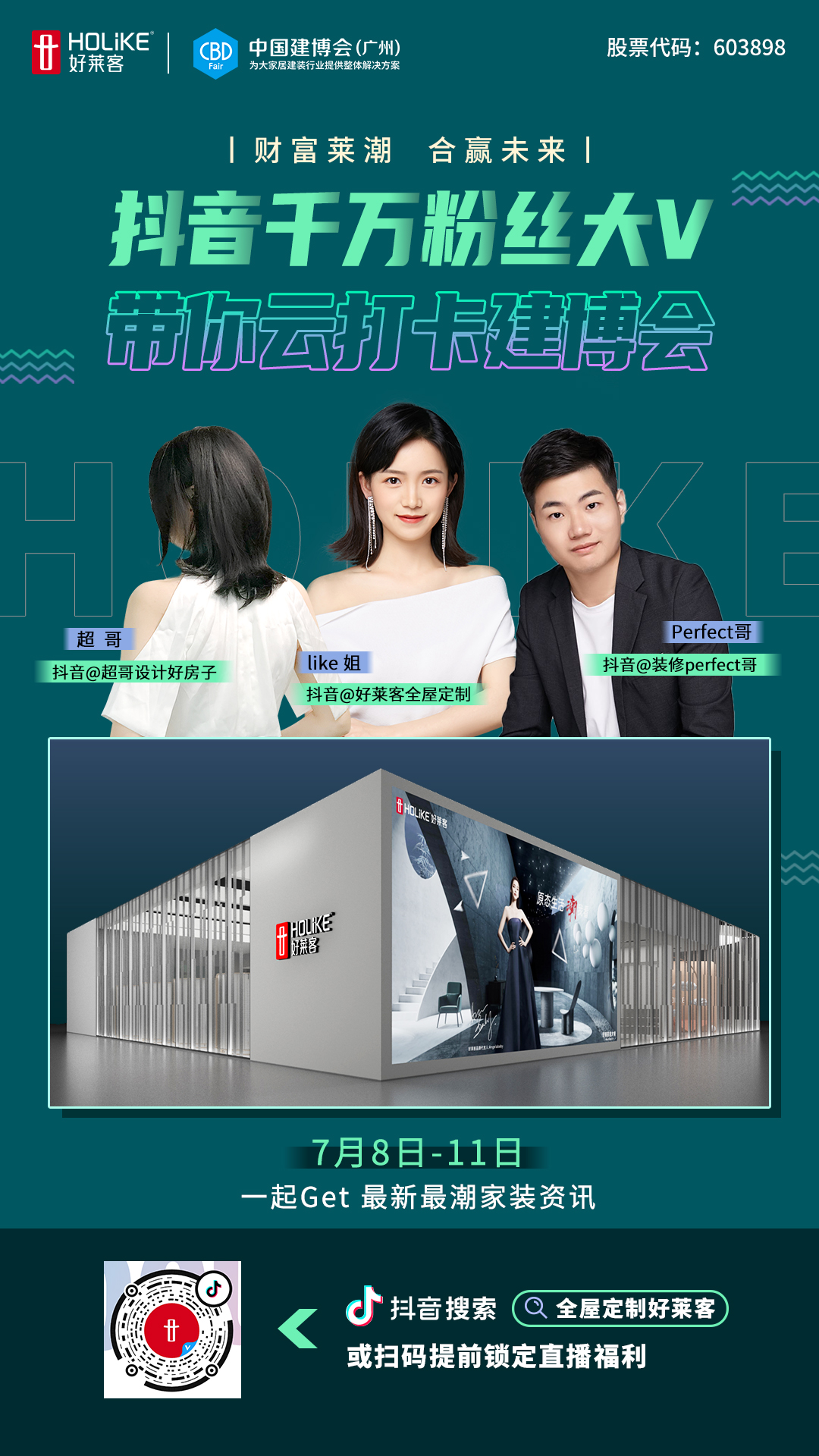 7月8-11日,抖音千万粉丝大V——@like姐、@装修pefect哥、@超哥设计好房子将到现场直播打卡逛展,带大家在线“云”体验四大人气潮新品功能,并详细讲解展厅风格,为此次建博会打call。更多福利,抢先爆料,扫码提前锁定,机会不容错过!
