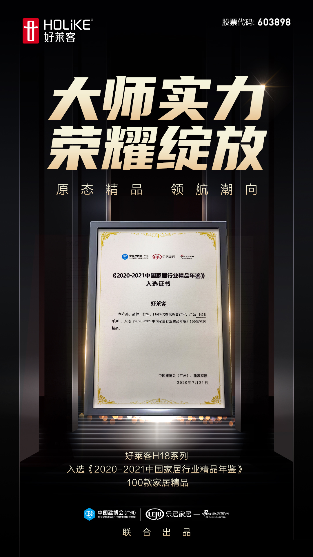 在展会期间举行的“了不起的家居质造·《2020-2021中国家居行业精品年鉴》发布会”中,好莱客的品牌形象产品——H18系列,实力入选《2020-2021中国家居行业精品年鉴》100款家居精品。
