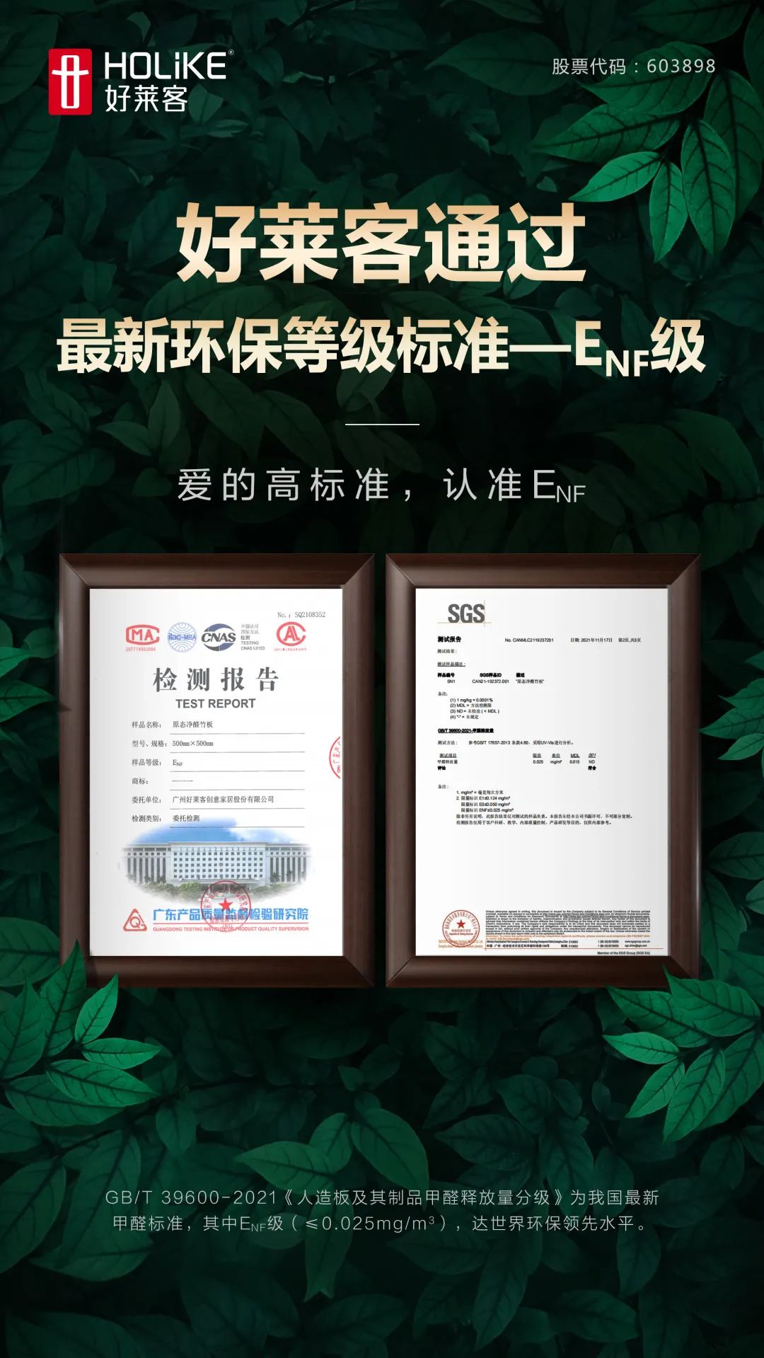 家居行业环保先锋品牌好莱客多年来一直坚持对环保的极致追求,近日好莱客原态系列板材:原态净醛竹板、原态板、原态中纤板三种基材接连通过SGS、广东质检院两大权威机构ENF环保标准检测,这不仅是好莱客原态系列产品环保要求达到国内环保最顶端,也是好莱客始终站在环保第一线的重要体现。