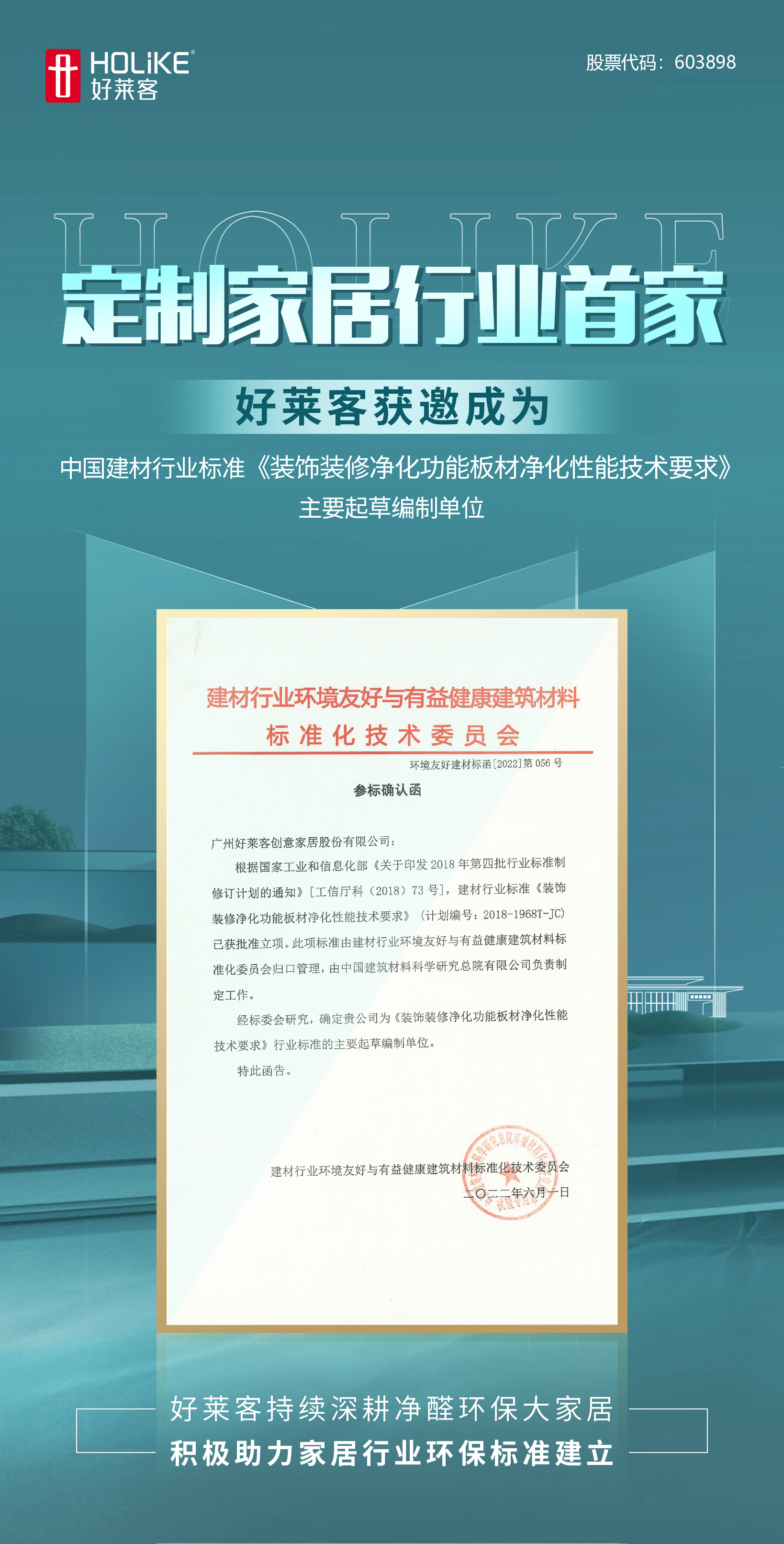 近日,定制家居大师好莱客再添喜讯, 好莱客获邀成为中国建材行业新标准《装饰装修净化功能板材净化性能技术要求》(计划编号2018-1968T-JC)主要起草编制单位,成为定制家居行业首家确认参标企业。