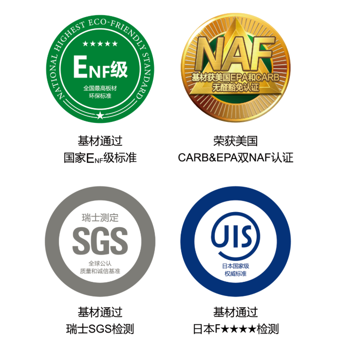 好莱客原态系列板材自问世以来,凭借优异的原态环保品质已陆续通过四国权威环保标准:中国ENF级标准、美国双NAF认证、瑞士SGS检测认证、日本F4星检测认证;其中ENF级被称为“史上最严苛的人造板新国标”。好产品,不畏国家及行业高标准考验。
