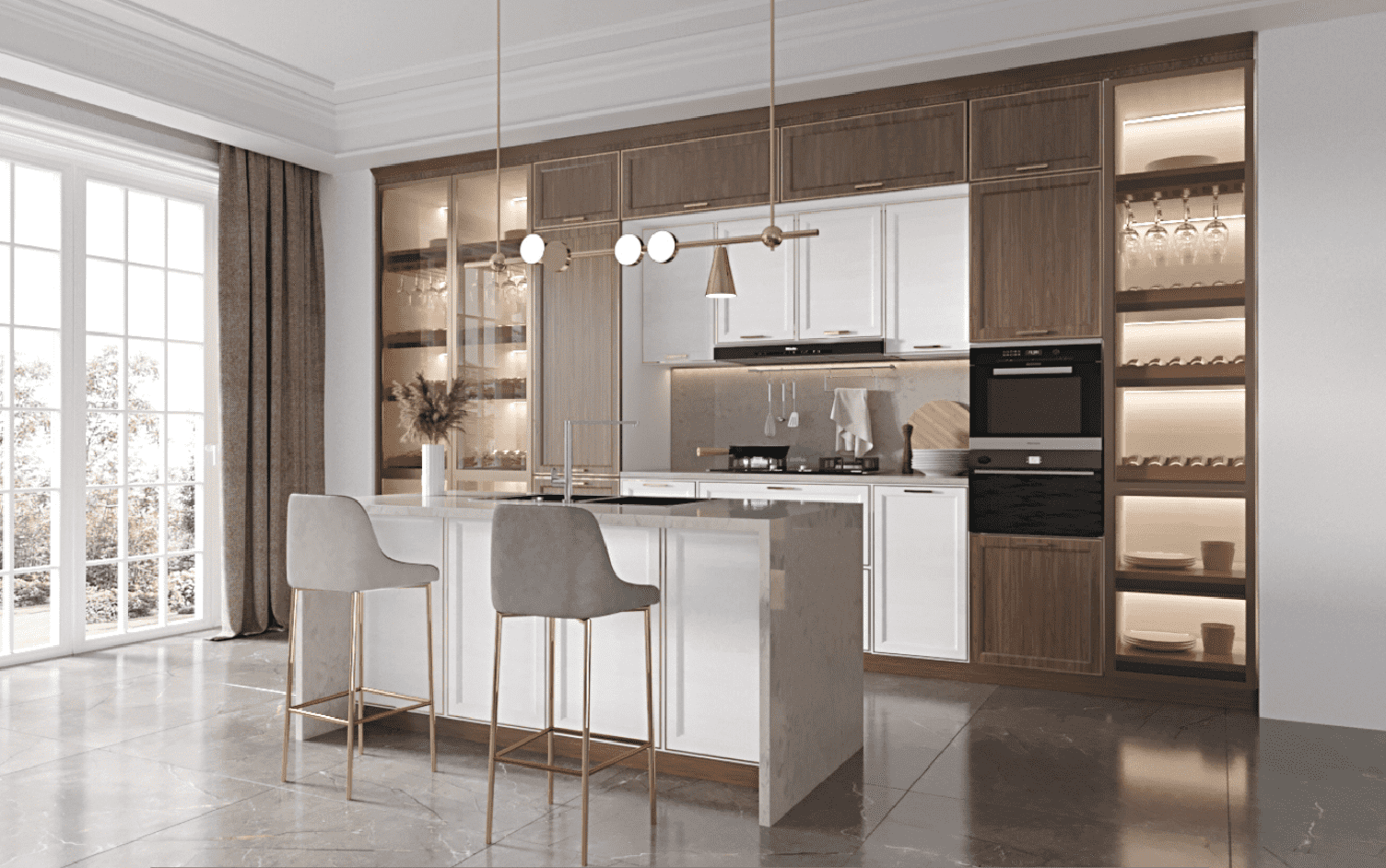 整体厨房:涵盖整体配置、整体设计、整体安装,将橱柜 、厨具及各种厨用家电按形状、尺寸及使用需求进行合理布局,实现厨房空间风格一体化。