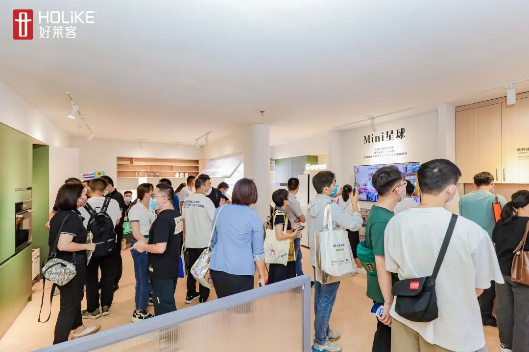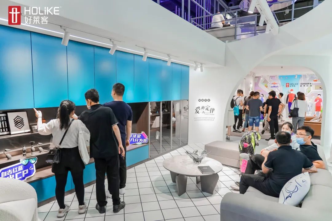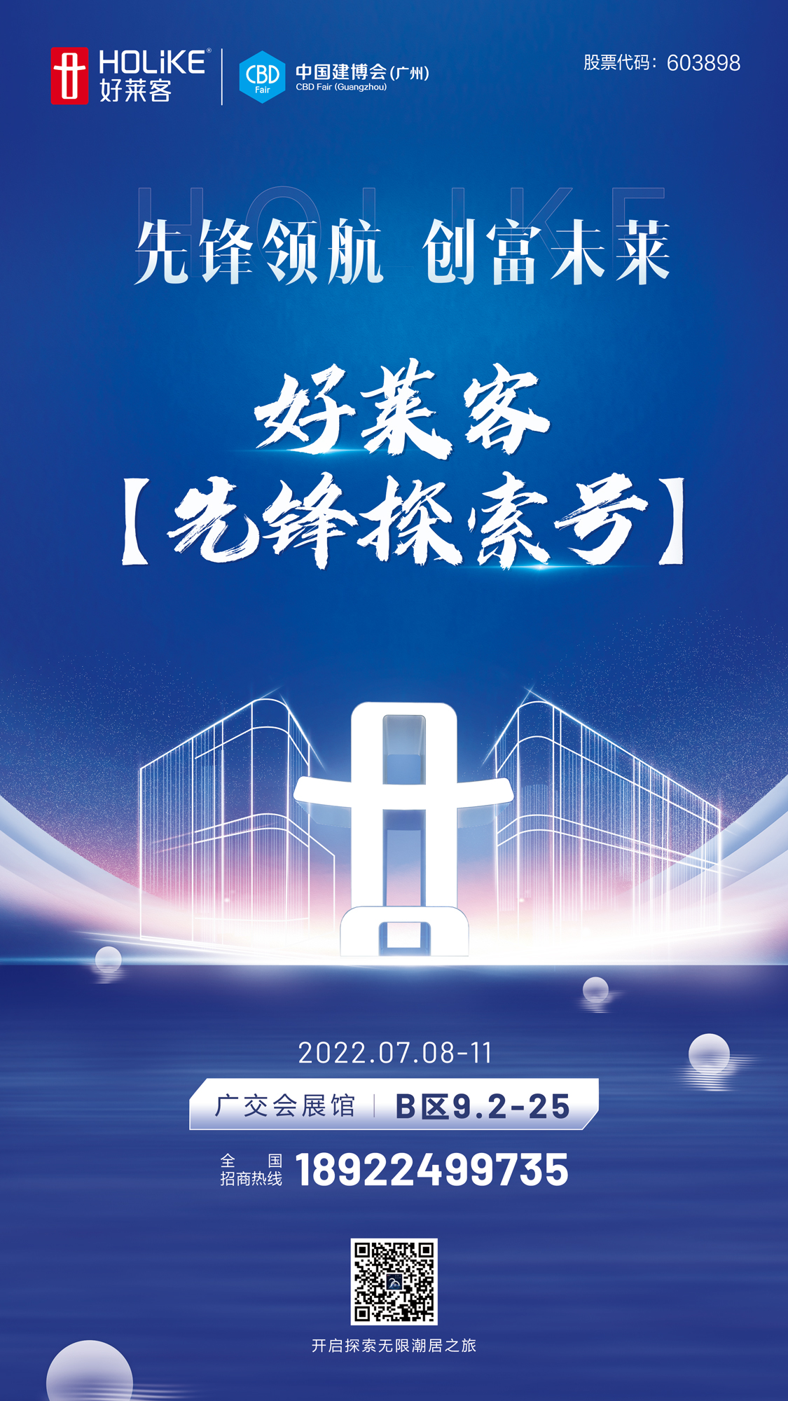 2022年7月8日,好莱客#先锋探索号#在2022中国建博会(广州)官方首发,“潮剧同款、冠军潮家、原态G6、Mini星球、潮家门墙、潮玩SHOW场”6大主题空间闪耀亮相,为新时代“潮咖”带来一场未来的“潮PARTY”。大“H”为潮头,向着未来航行,20组蓝色灯光矩阵是激起的浪潮,未来的方向是基于20年的沉淀。