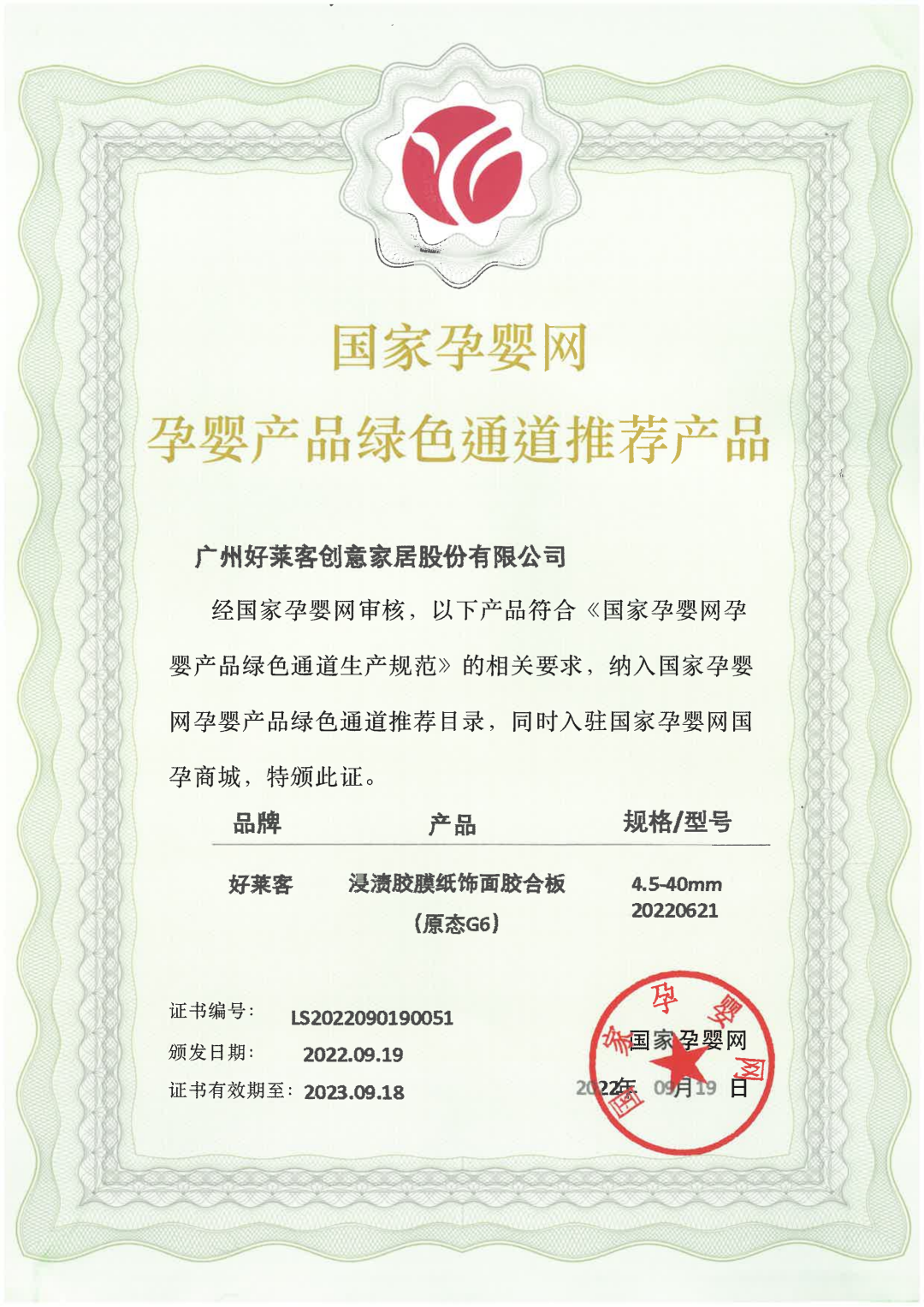近期,好莱客原态G6、原态净醛板经“国家孕婴网”产品绿色通道的严格把关、多层筛选及检测审核,确认符合《国家孕婴网孕婴产品绿色通道生产规范》相关要求,正式纳入国家孕婴网孕婴产品绿色通道推荐目录,并入驻国家孕婴网国孕商城,再次凭借卓越的原态环保实力领潮定制家居行业。