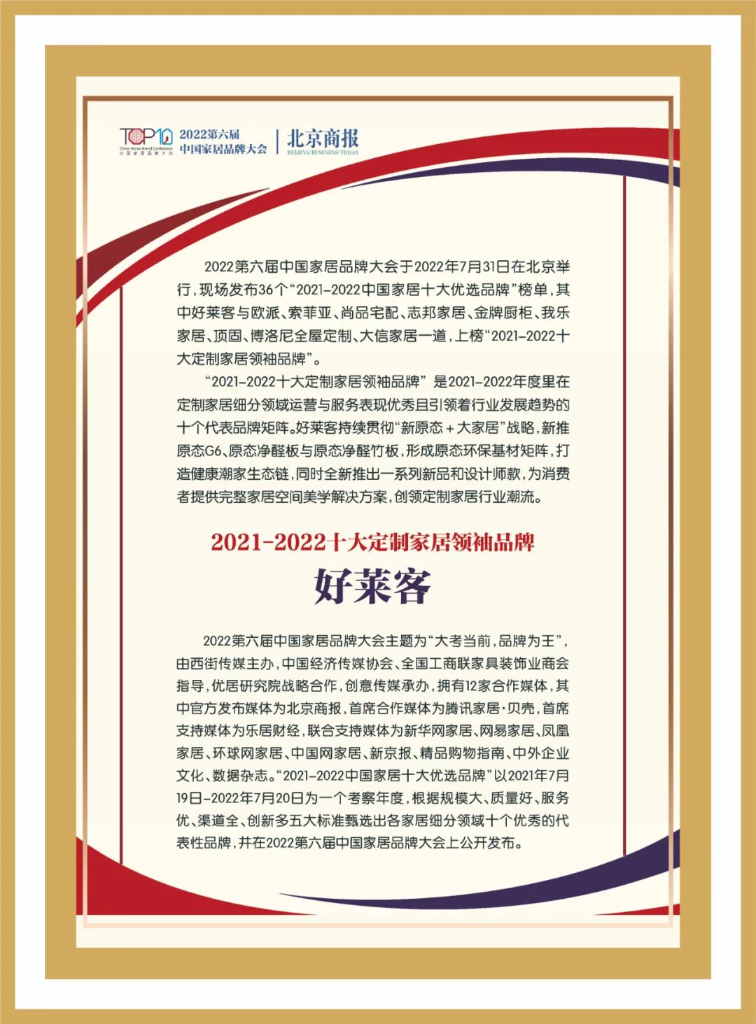 好莱客凭借多年的发展与沉淀在众品牌中脱颖而出,再夺“2021-2022十大定制家居领袖品牌”!2021-2022年度里好莱客持续贯彻“ 新原态+大家居”战略,新推原态G6、原态净醛板与原态净醛竹板,形成原态环保基材矩阵,打造健康潮家生态链,同时全新推出一系列新品和设计师款,为消费者提供完整家居空间美学解决方案。自2017年中国家居品牌大会创立以来,好莱客6年连获殊荣,是大会对企业实力、产品质量、品牌价值的权威认证!