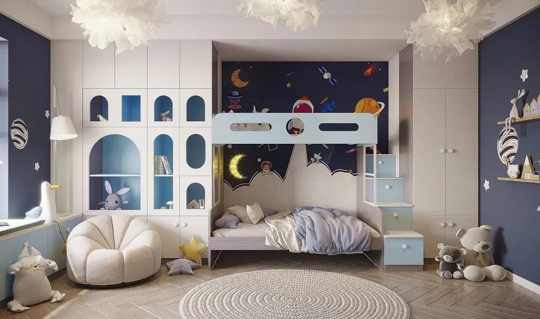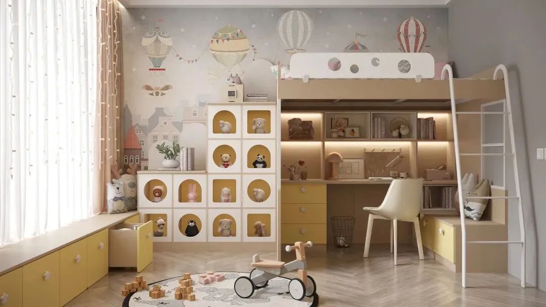 在收纳空间上,上下床的设计不仅节省了空间,还给二胎家庭的孩子增加交流互动,床下的书桌挡板增添了学习时的私密性与沉浸感,床边的储物柜与飘窗一体化设计,极大的满足了收纳的需求。