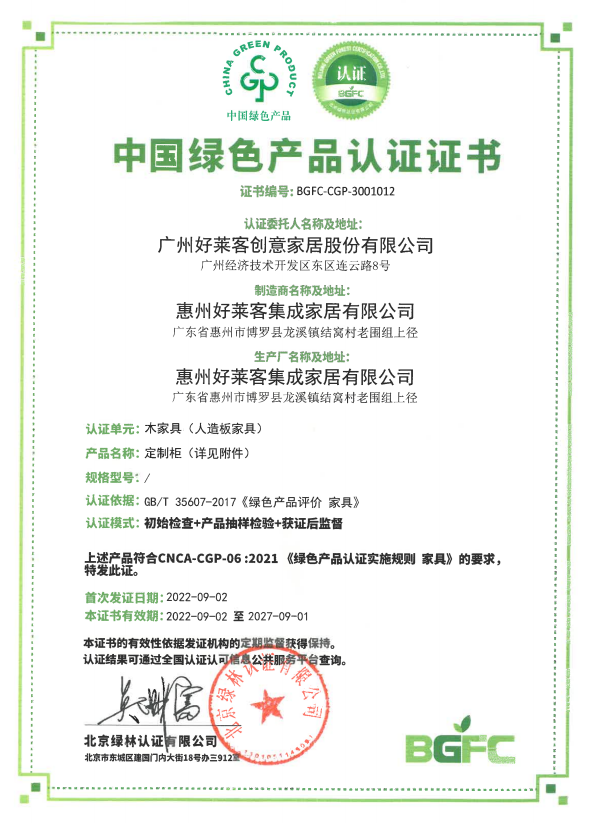 值得一提的是,好莱客在近期还获得了《中国绿色产品认证证书》,代表好莱客产品全生命周期均符合绿色发展理念和环境保护要求。除此之外,原态系列产品更是获得了国标环保标准ENF级,以及美国双NAF无醛豁免认证、日本F4星认证、瑞士SGS认证等多项国际权威环保认证,达到国内环保最顶端标准,以原态实力持续位列定制家居行业环保先锋地位,强势引领行业发展。