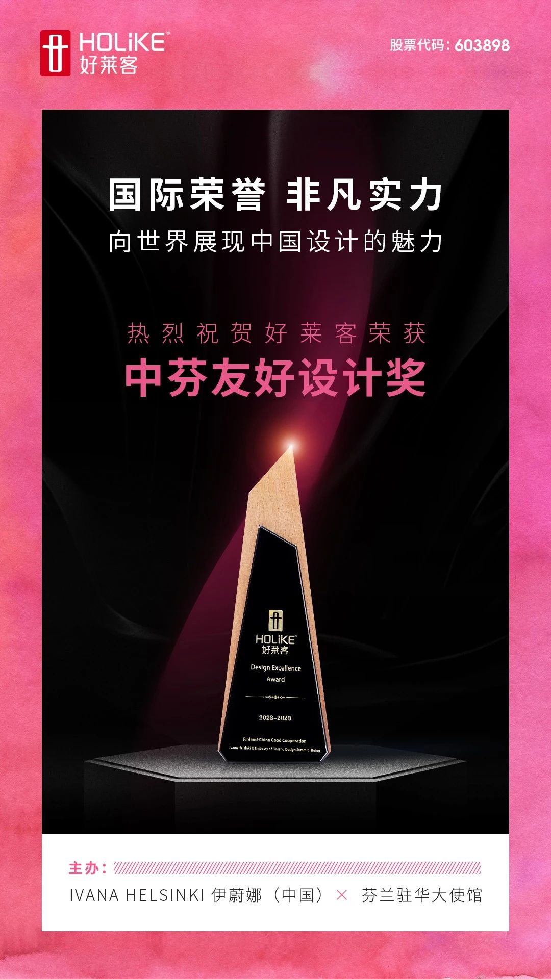 5月11日,来自北欧的顶级设计品牌Ivana Helsinki伊蔚娜(中国)2023时尚发布会在芬兰驻华大使官邸盛大举办,好莱客作为战略合作品牌以及中芬设计优秀合作品牌受邀参与,并在此次发布会上荣获芬兰驻华大使馆颁发的“中芬友好设计奖”,证明了好莱客的设计创新力以及与国际接轨的非凡实力,让世界看到中国设计的魅力。