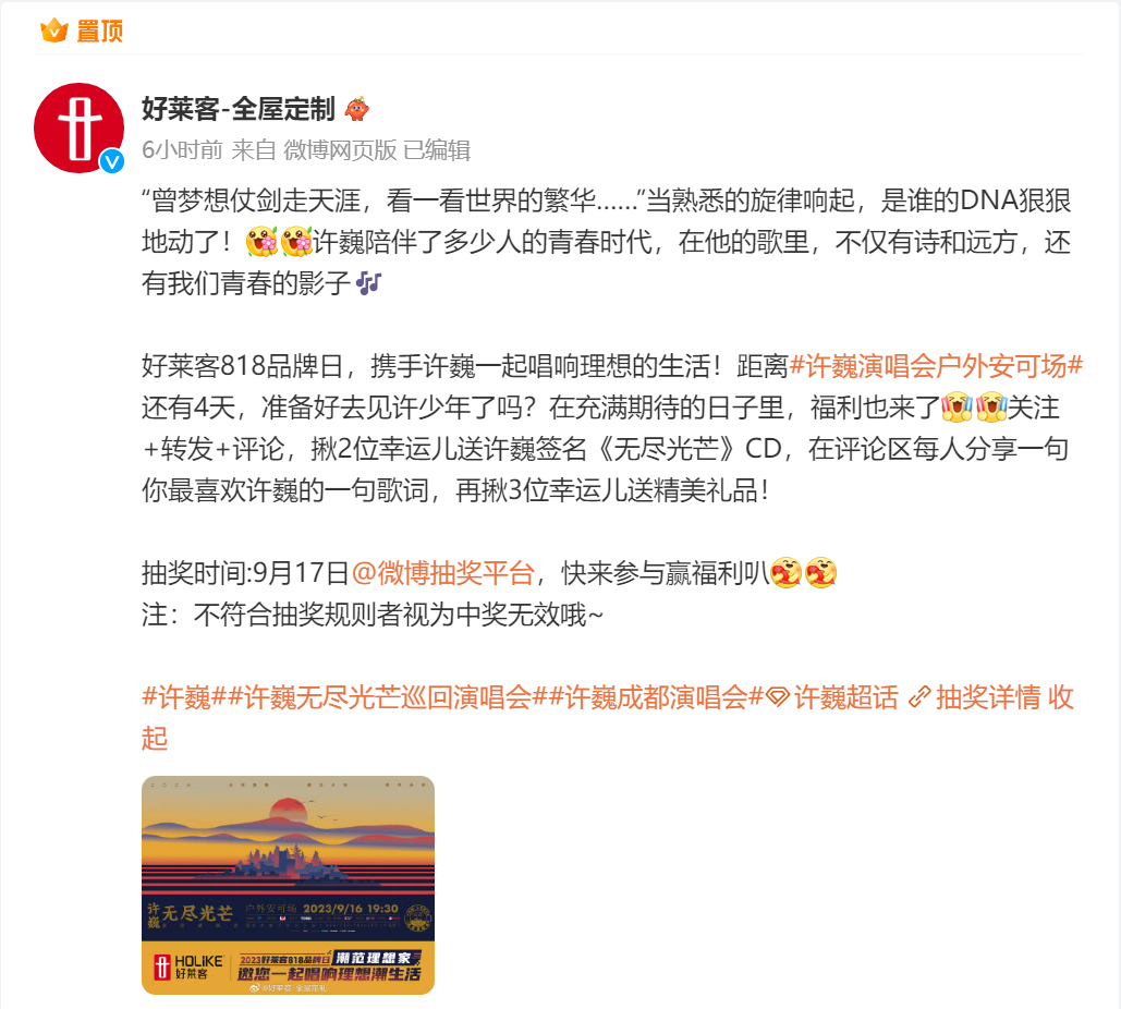 值得一提的是,为了更好感谢大家的大力支持,好莱客线下发起打卡参与互动赢福利活动:参与许巍演唱会成都站的粉丝到达现场,寻找在现场的好莱客元素(如logo等)打卡拍照并带话题#好莱客好好生活企划 #潮范理想家@好莱客 发布笔记,随机抽取优质笔记送许巍签名CD!