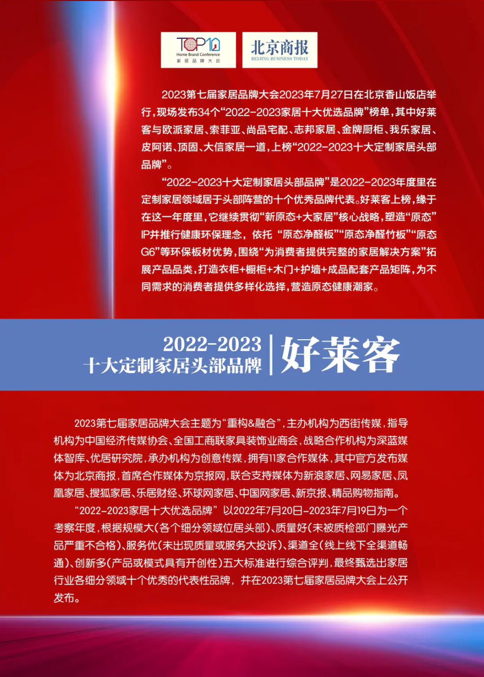 据了解,本次报告中的所有入选品牌都是在今年7月举办的以“重构&融合”为主题的2023第七届家居品牌大会中,经过层层严格遴选而出的“2022-2023家居十大优选品牌”。该榜单是以2022年7月20日-2023年7月19日为一个考察年度,根据规模大、质量好、服务优、渠道全、创新多五大标准进行综合评判,能入围者皆为行业优秀代表性品牌。好莱客凭借强大的品牌实力、过硬的产品品质、优质的服务能力和优越的渠道力及创新力,荣誉入选“2022-2023十大定制家居头部品牌”榜单,再一次向外界证明了好莱客品牌及产品的口碑和价值。