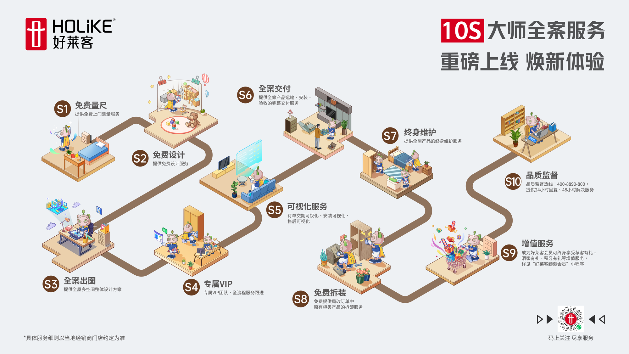 随着体验消费时代的到来,2023年好莱客发力服务升级,对长期坚持的“大师服务”进行焕新。在服务标准上对原有“10S定制管家服务”进行精益革新,重磅首发以“免费量尺、免费设计、全案出图、专属VIP、可视化服务、全案交付、终身维护、免费拆装、增值服务、品质监督”为核心的全新“10S大师全案服务”,全面提高好莱客的服务水平,为消费者带来更高效、更落地的解决方案,让更多消费者从下单前期、安装中期、验收后期,都能享受到高效化、人性化的服务体验;同时,新标准的推出与落地,助推服务更加流程化、规范化、可视化,实现了终端的服务水平跃级。