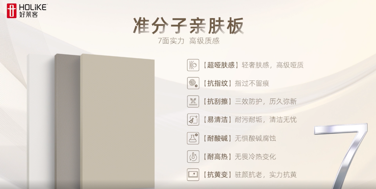 相比传统UV板材,好莱客准分子亲肤板具有更好的性能、质感、硬度和通透性。它采用德国先进准分子固化技术,用172nm单一波长的UV灯照射油漆表面,在氨气的环境下可以立即固化。经过UV准分子肤感线,打造出如新生婴儿肌肤般触感,亲肤丝滑,细腻柔和的治愈系空间,为母婴家庭构筑了一个更健康舒适的家,提升家居生活幸福感。同时,好莱客准分子亲肤板还考虑到了不同的家居生活化场景,为千万家庭打造了超哑肤感,抗指纹,抗刮擦,易清洁,耐酸碱,耐高温,抗黄变7重守护。