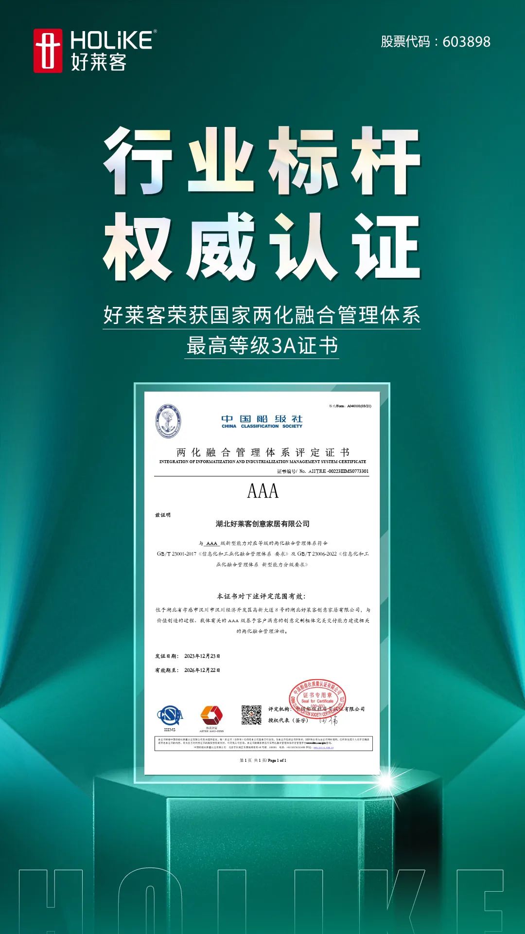 本次荣获两化融合管理体系AAA级评定证书,这既是好莱客向数字化转型的阶段性成果,也是政府主管部门及社会各界对企业信息化发展、技术研发及智能制造的肯定与认可。