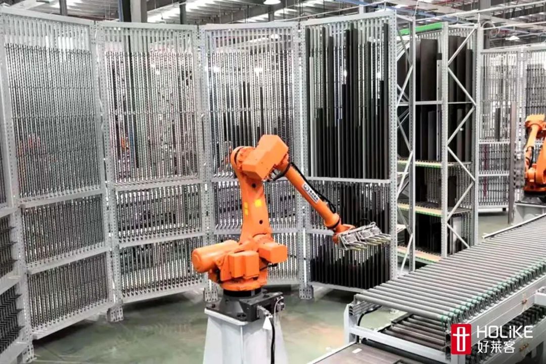 汉川基地采用的是自动适配集成分拣系统,智能分拣+智能包装,通过大数据智能分配立库,4组8台机器人同时有序叠放同一个订单的板材包装,使入库出库效率时刻保持最优状态,能够达到1分钟分拣19块板件、准确率100%的超高效率。