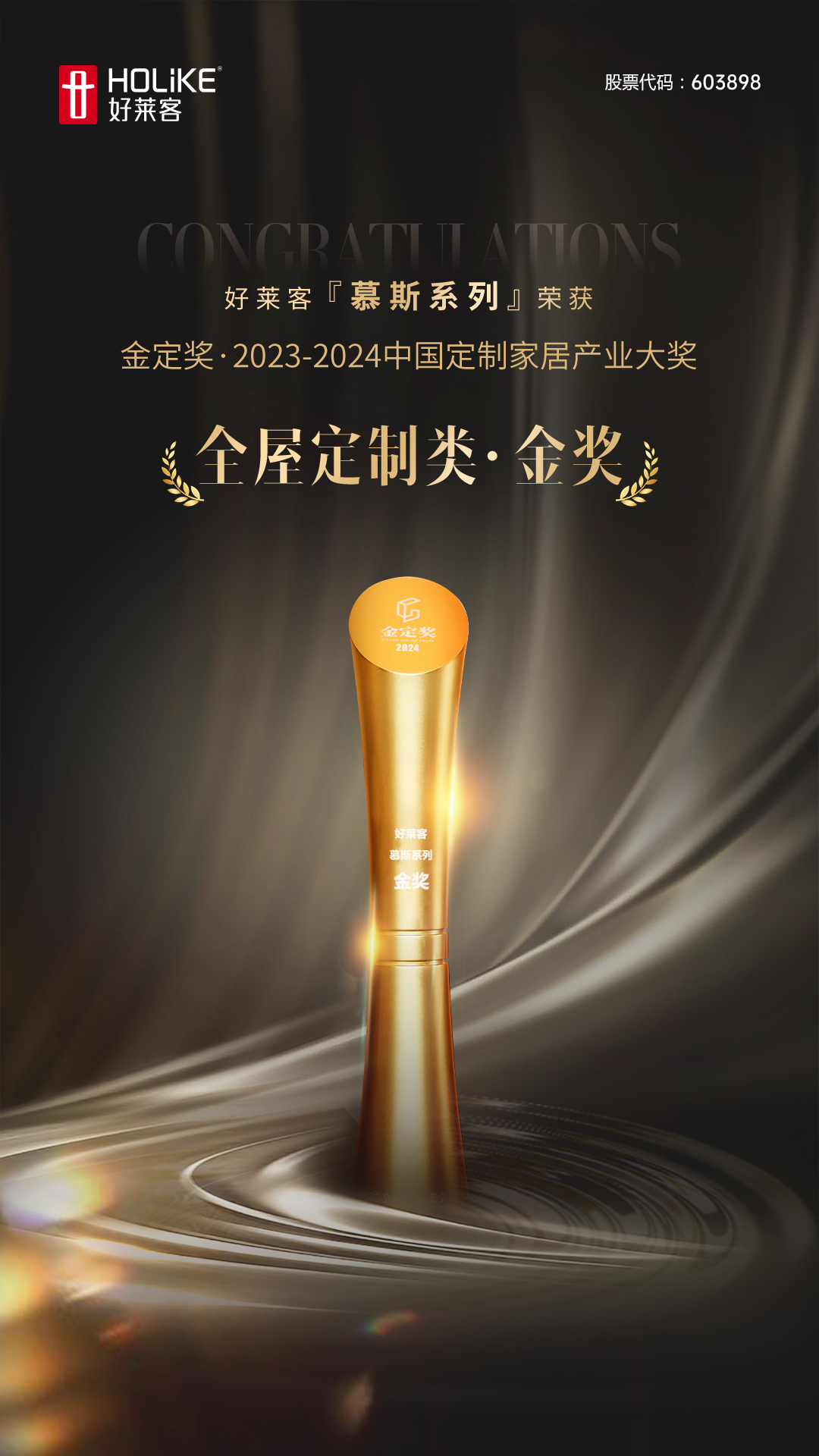 好莱客自创立以来,始终坚持“定制家居大师”品牌定位,承袭大师工匠精神,以“大师设计、大师品质、大师服务”作为内核和驱动力,为每个中国家庭量身定制高品质的家居方案。回望20多年的发展,好莱客在产品创新、原创设计、环保领跑等方面多维实力闪耀,推动家居行业发展升级,并备受业内与消费者的认可与信赖,“中国定制家居产业大奖金定奖”是对好莱客持续引领家居产品创新的最好嘉奖。