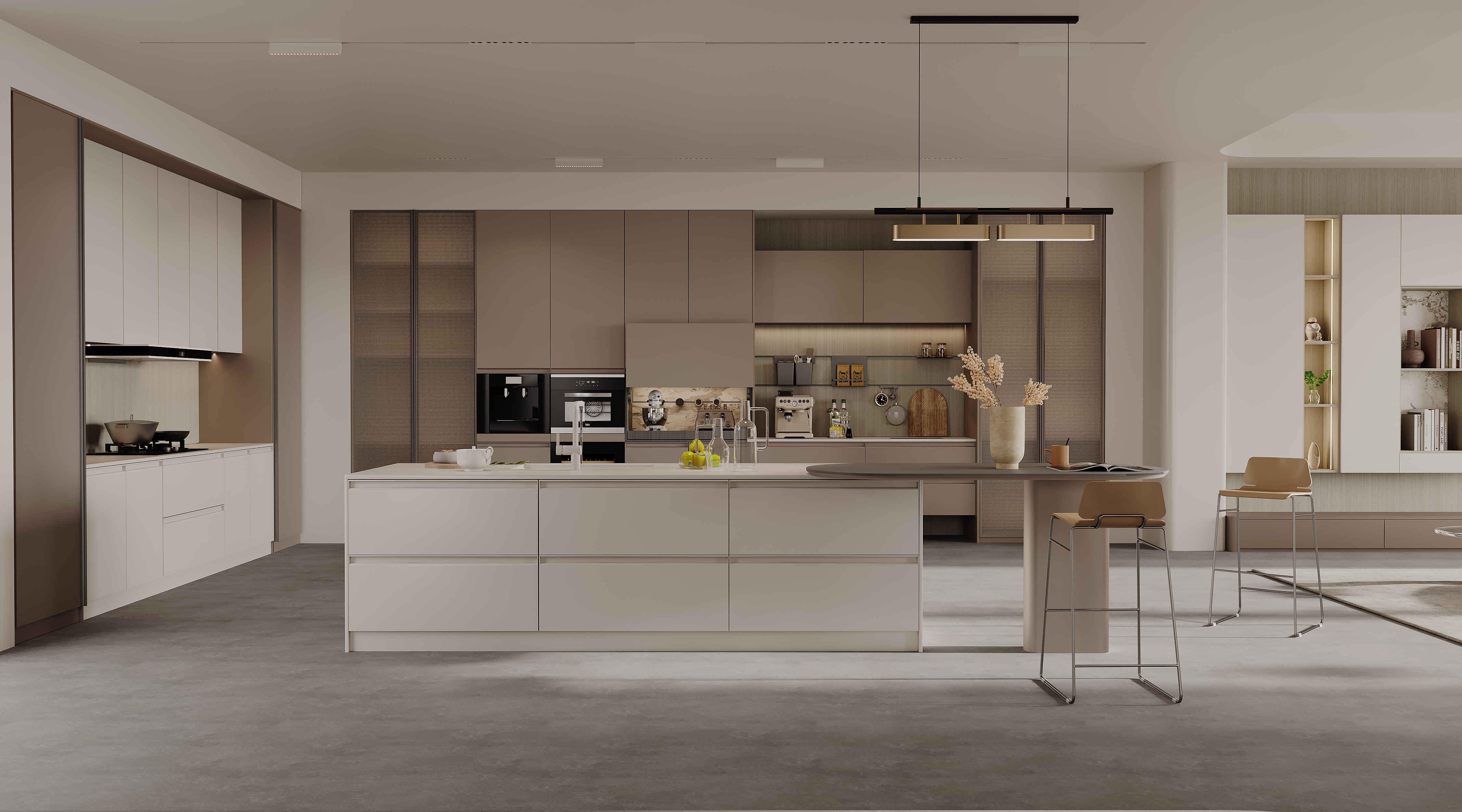 水吧特调区域、酒水区,小厨电使用区等功能模块。塑造了一个美食共享、情感共享的厨房空间,不仅满足了用户多样化的饮食习惯,赋能空间多样化,更好地促进了人与人之间的情感分享和交流,为烹饪过程增添了乐趣,延伸家的无限可能。