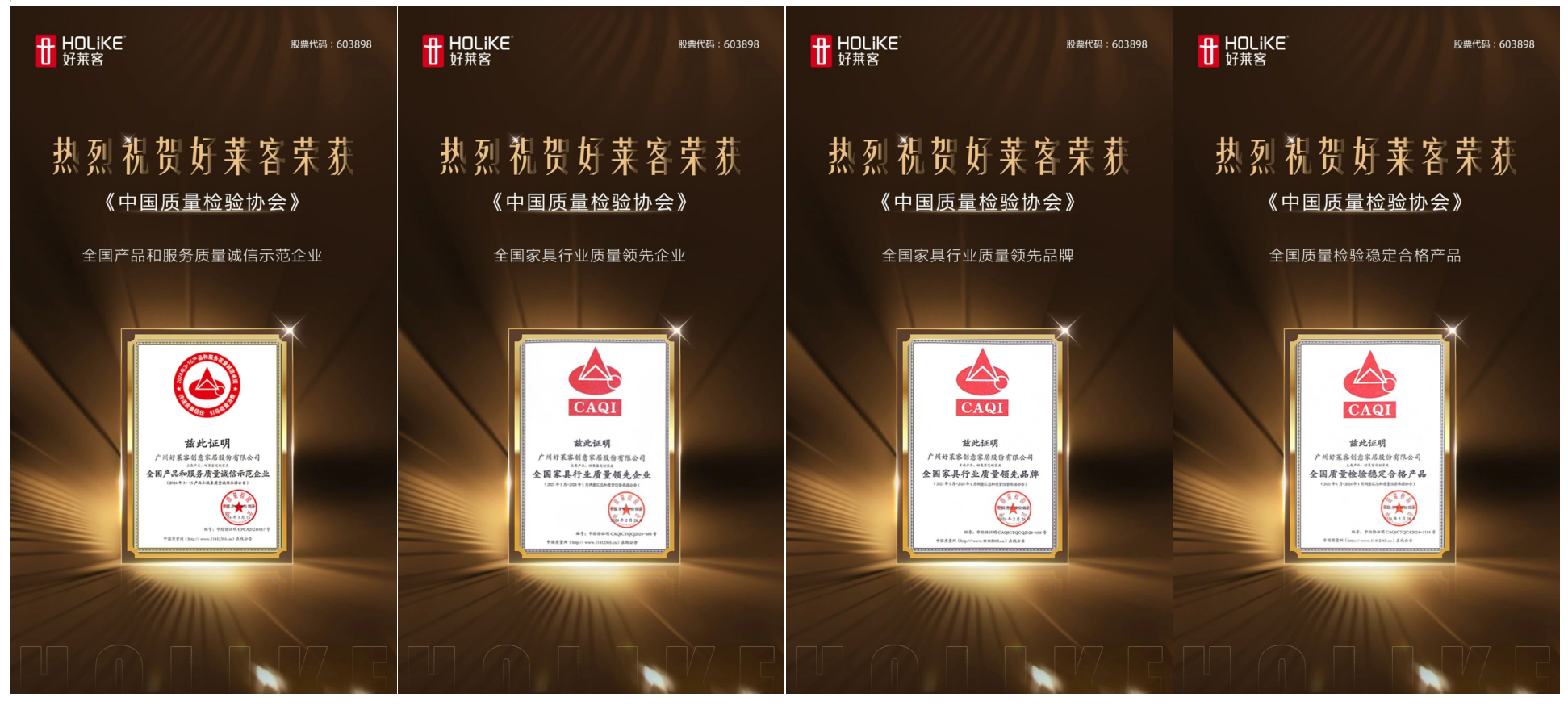 今年3月,好莱客更是凭借长期稳定的产品质量与服务质量,得到中国质量检验协会高度认可,被授予“全国产品和服务质量诚信示范企业””全国家具行业质量领先企业“”全国家具行业质量领先品牌””全国质量检验稳定合格产品”4项荣誉,这些成就的取得是对好莱客长期品质建设成就的肯定,同时体现了好莱客对产品质量和创新的承诺。