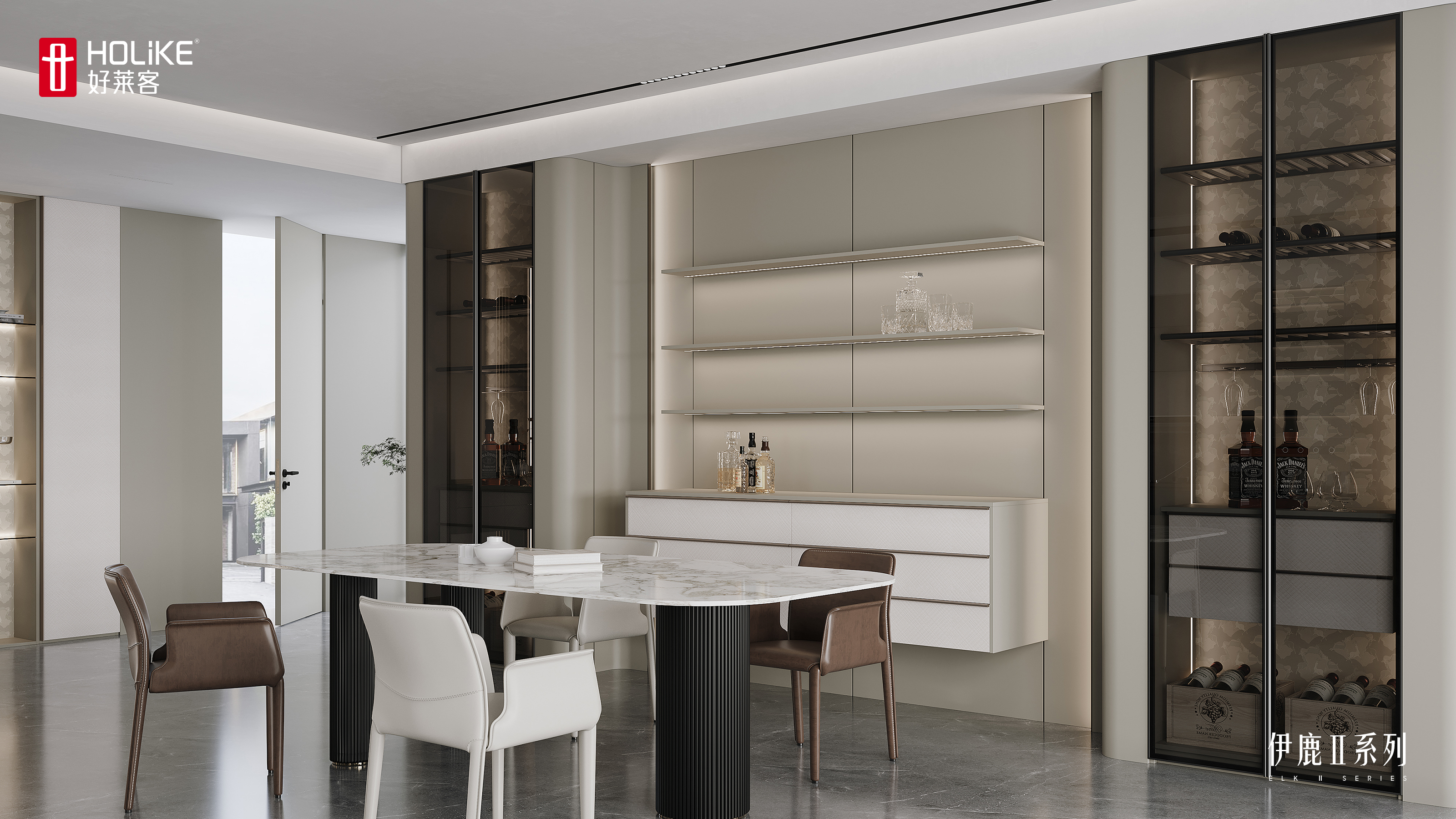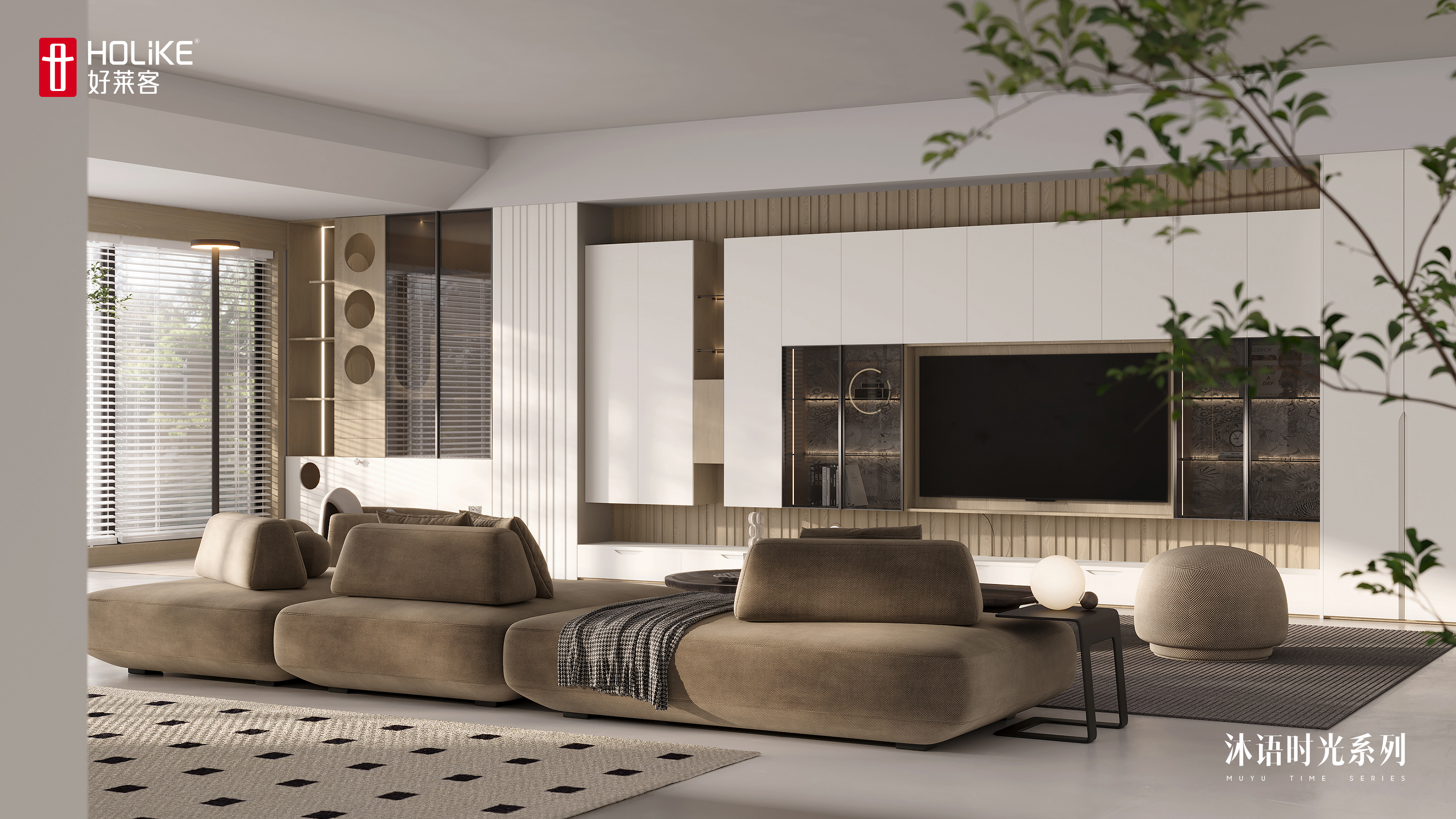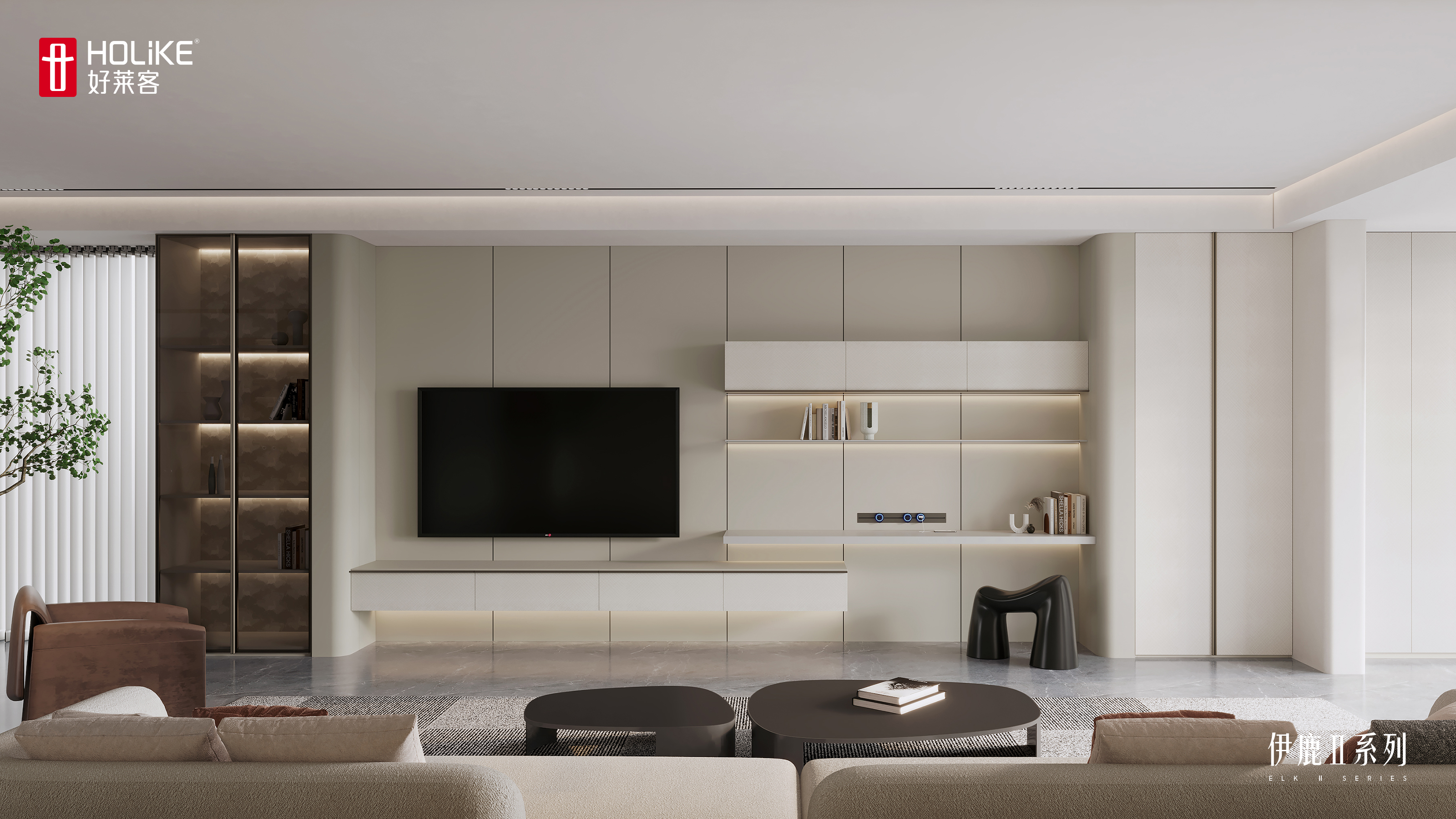 伊鹿Ⅱ系列是专为追求生活仪式感的品质人群打造的质感艺术之家。系列以“九色鹿与云朵 ”为灵感来源,创意演绎九色鹿穿梭云间的流动意境。引用密斯·凡·德罗“流通空间”大师级设计理论, 融合好莱客创新悬浮工艺,营造自由、灵动、高级的空间氛围。