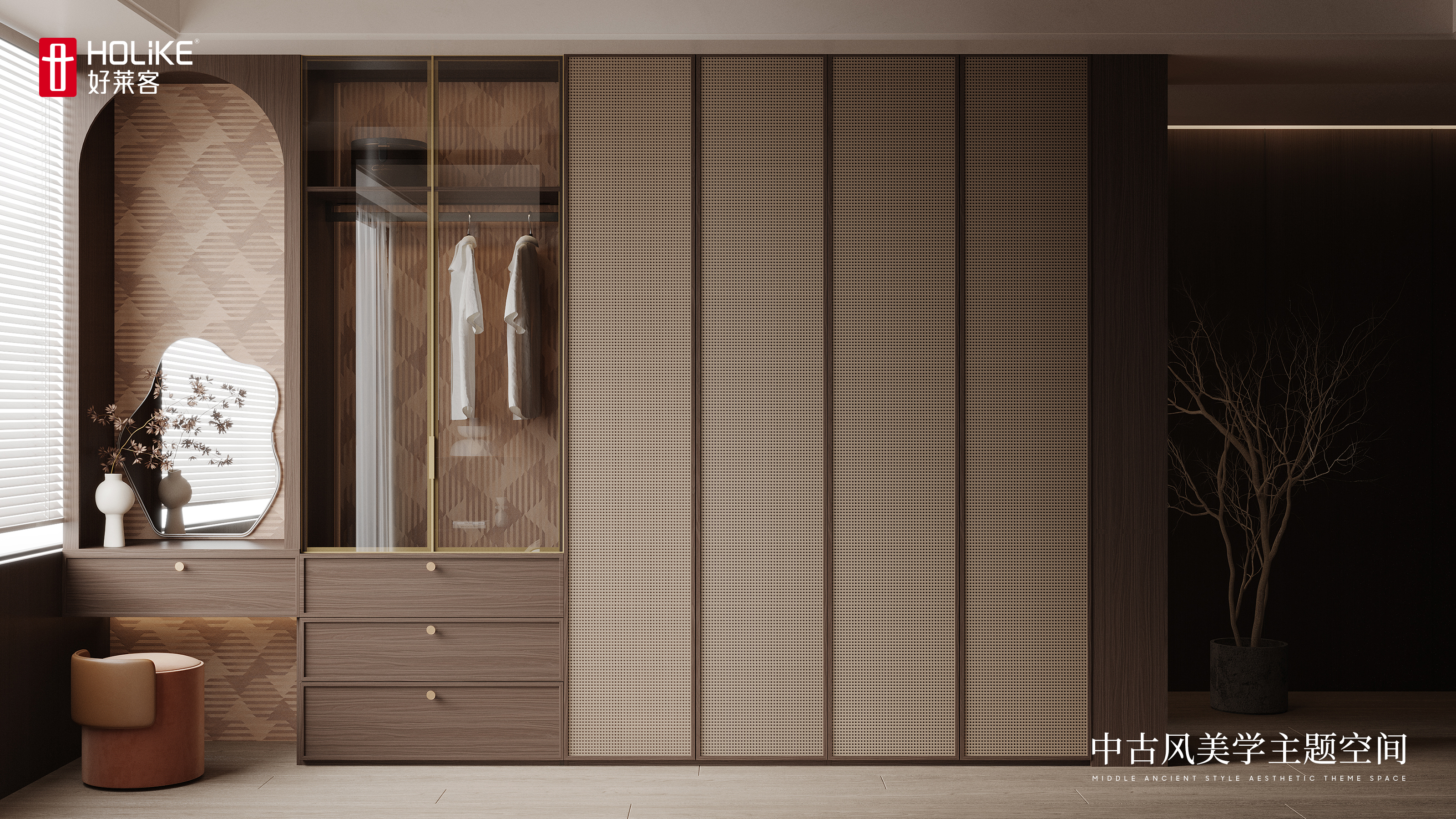 经典重塑,复古美学,中古风美学主题空间以复古的深棕色系基调为主,搭配立体SPL包覆门款及创新应用复古藤编工艺,为精致美学家群体打造一个中古氛围艺术之家。