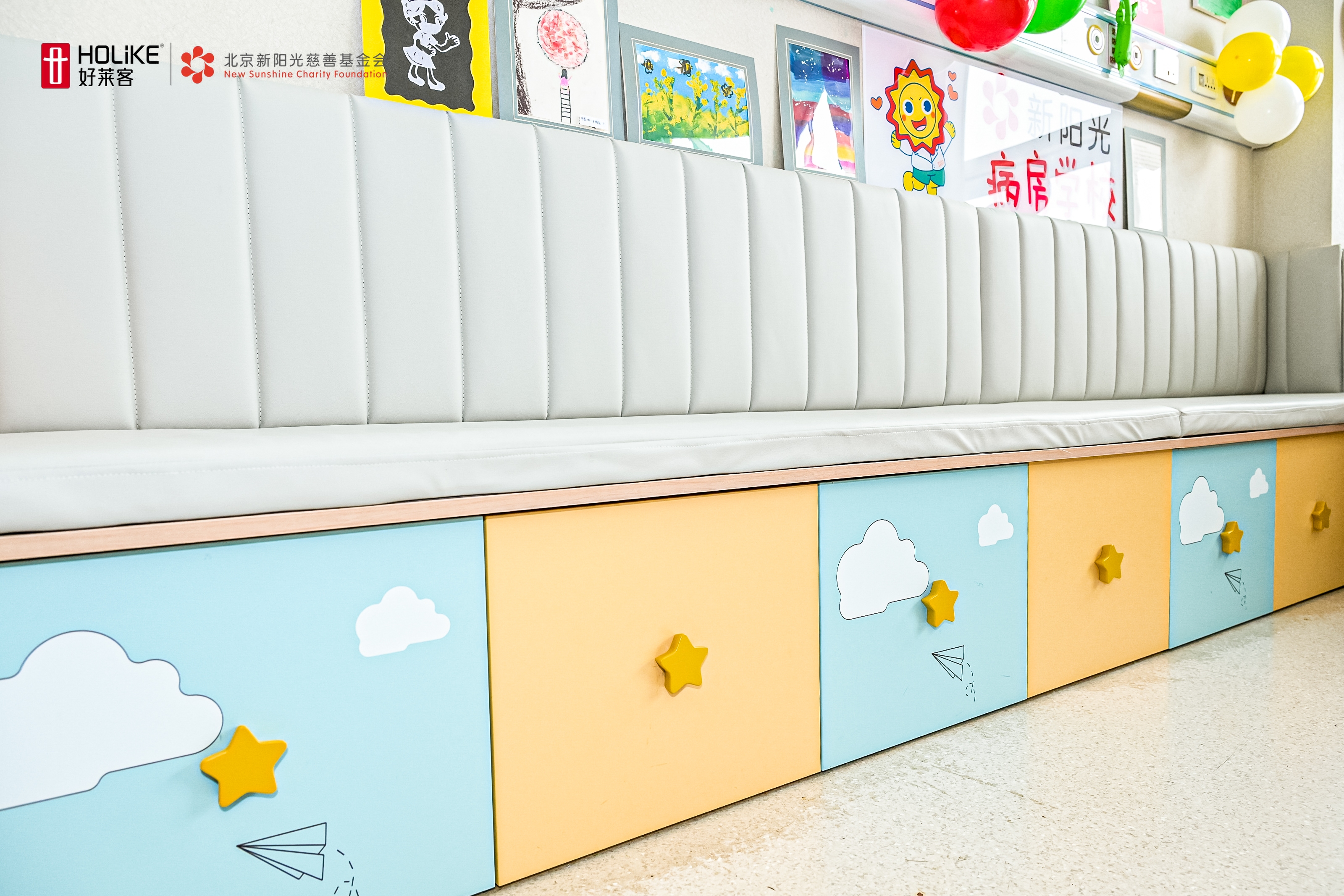 作为病房学校中家具的捐赠者,好莱客考虑到白血病儿童的特殊性,特意选用了净醛防霉抗变形的原态净醛竹板,保障孩子学习环境的安全性;同时,在设计中也结合了孩子们的日常使用需求,采用了封闭与开放结合的形式,让孩子们的手工作品可以尽情展现;在外观上,也结合了杏白、奶酪黄、晴空蓝的花色,让整个空间变得童趣又活泼。