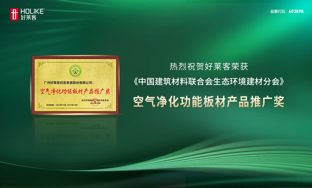 在空气净化功能板材方面,好莱客更是走在了行业前列,好莱客原态净醛产品(原态净醛竹板、原态净醛板),在实现基材生产过程中零醛添加的基础上,通过负离子净醛抗菌技术,实现24H持续净化家居空间中的游离甲醛等有害物质,并将甲醛分解成水分子和二氧化碳,达到清除室内甲醛、消灭细菌、净化空气的效果。凭借优秀的原态净醛产品环保品质,好莱客在全国定制行业头部品牌中率先获得由三大权威机构共同颁发的净化功能建材产品标识——【净醛标识】,真正实现产品净醛功能真伪可溯源,净化数据可例证,为广大消费者提供权威环保保障。“空气净化功能板材产品推广奖”的获得,充分展示了好莱客在技术创新和产品推广方面的强大实力。