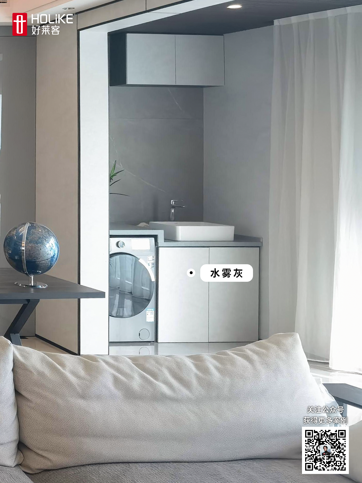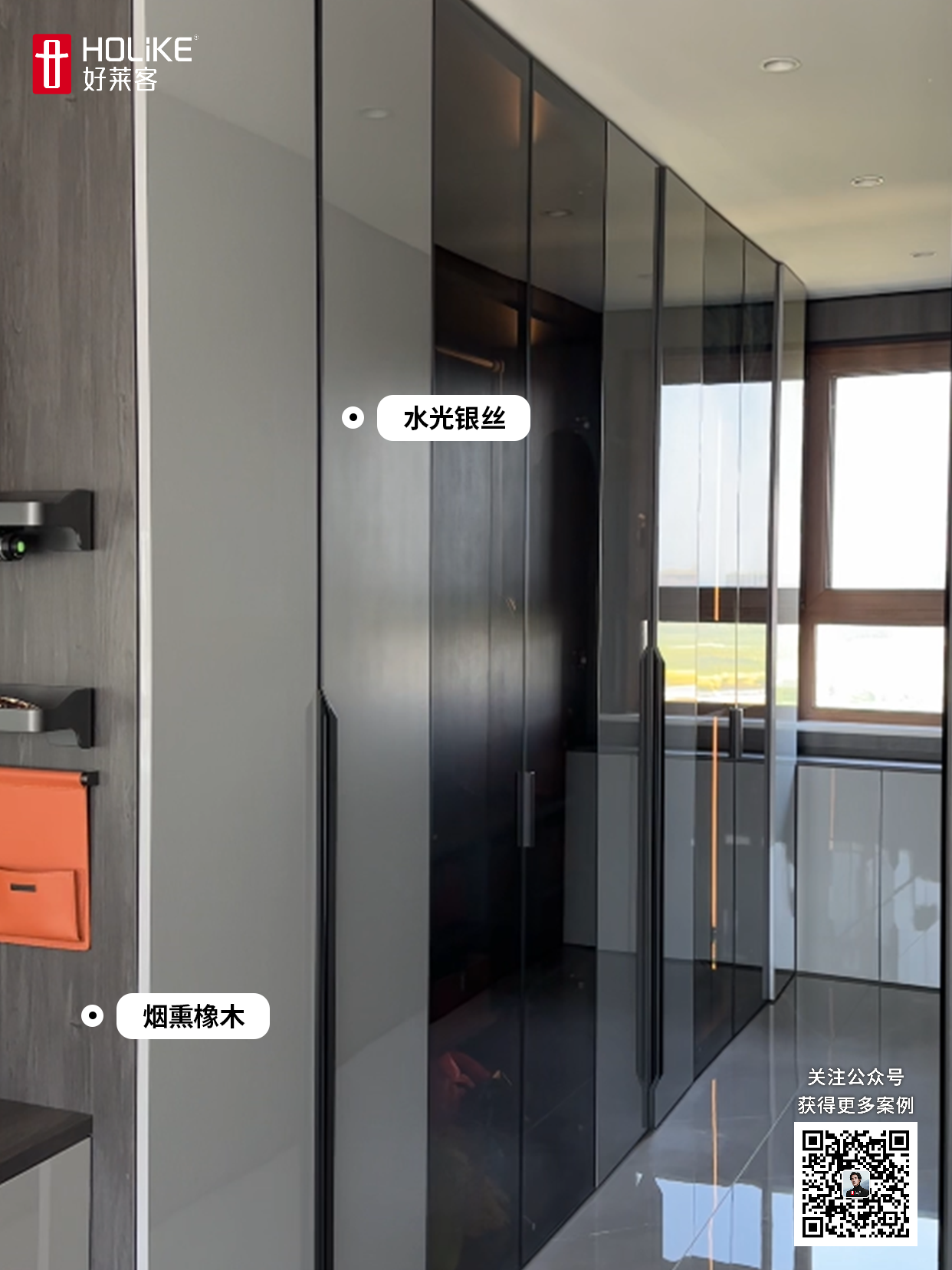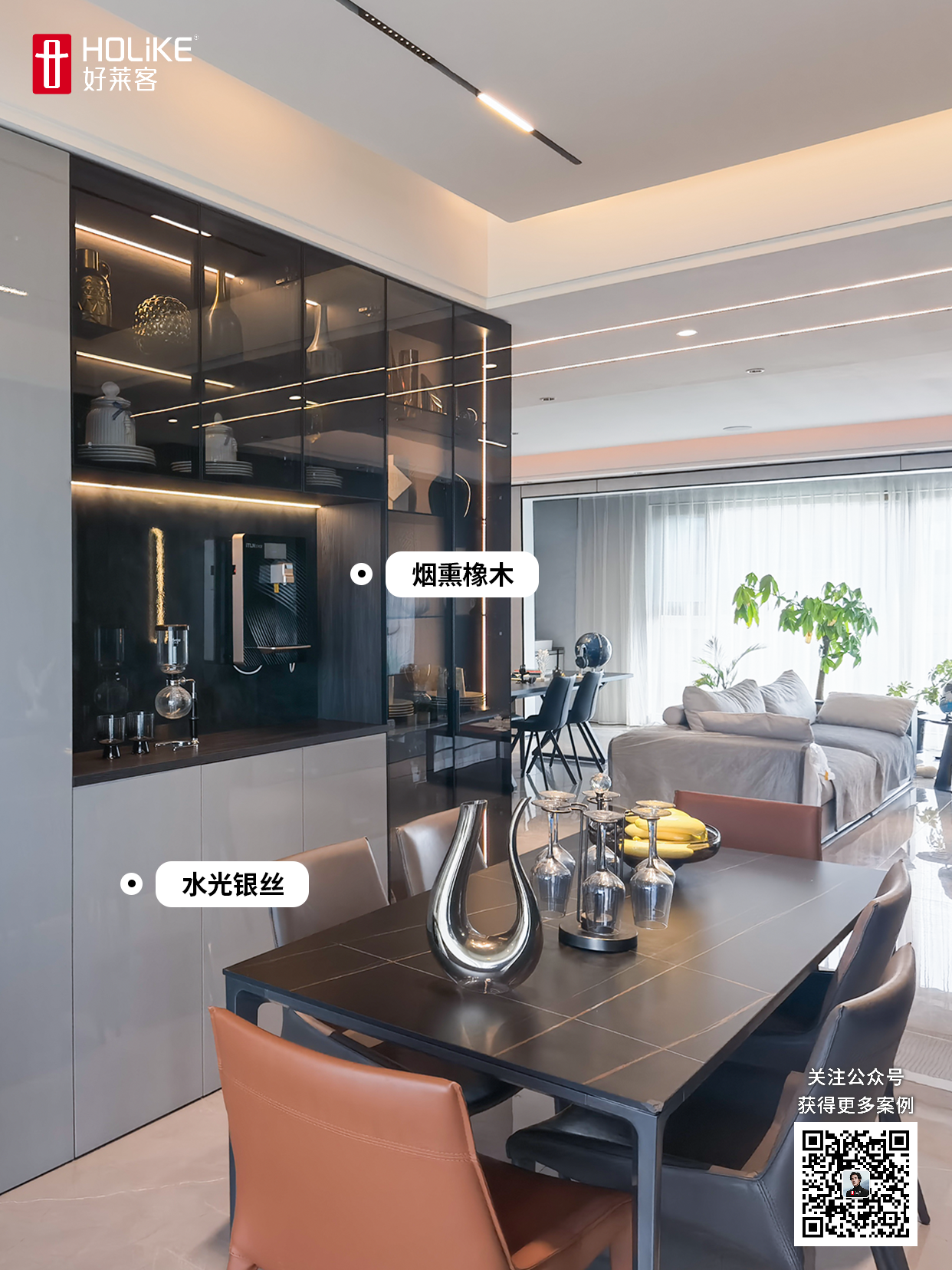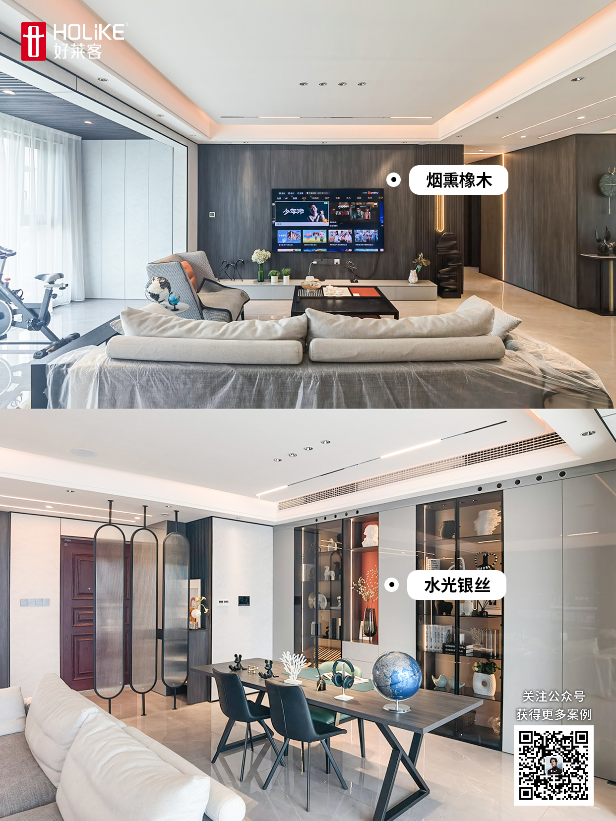 选用质感细腻的杏白+烟熏橡木花色护墙板